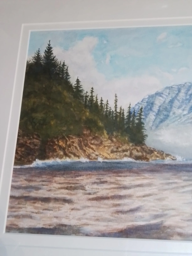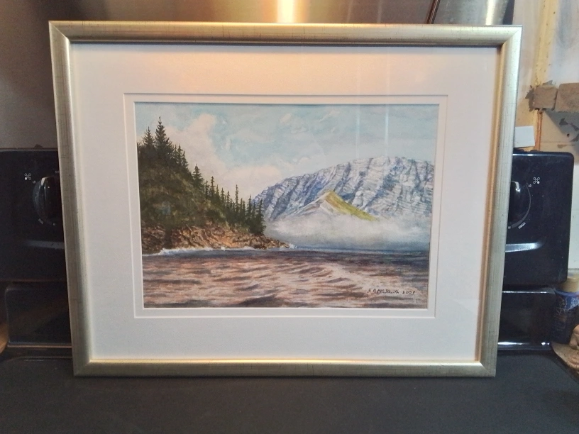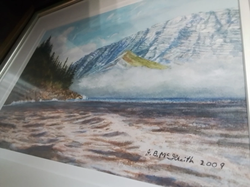 114Original Painting - signed McILRAITH - Canadian Art Original Watercolor Landscape Painting by McILRAITH Framed watercolour painting. Depicts a tranquil landscape featuring trees, mountains, and water. Signed and dated 2009. Beautiful colours and detail. Original Watercolour Painting on Paper by Canadian Artist - J.B. McILRAITH. Painting is framed, matted and under glass. Painting is Signed "J.B. McILRAITH", and dated 2009.Beautiful Lake scene with Mountains in the background. Watercolour painting is in very good condition, nice colours, no fading. Vintage wood frame is in very good condition showing some minor wear. Condition: see photos for condition. Measurements: Image: 9.5" x 13.5" Frame Size: 16" x 20" Pickup at Young Street and Steels Ave
