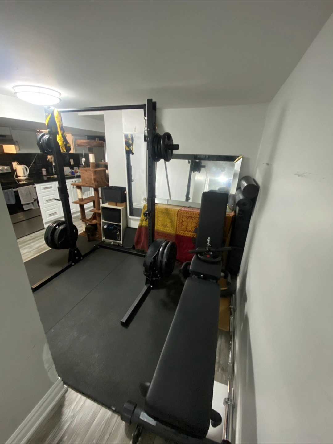 ❌Not selling anything individually❌ ⭕️Pick up only⭕️ Selling a weightlifting squat rack complete with a bench. Great for setting up a home gym and getting those gains! It's in good condition and ready for a new home. 🔵Weight plates (1lbs ✖︎$2.0) 5lbs ✖︎2 $10 10lbs ✖︎4 $80 25lbs ✖︎2 $100 35lbs ✖︎2 $140 45lbs ✖︎4 $360 55lbs ✖︎2 $ 210 🔵Squat rack $570 https://squat6standstoronto.ca/collections/the-6ix-collection/products/squat-stand 🔵Pullup attachment $225 https://squat6standstoronto.ca/collections/the-6ix-collection/products/pull-up-bar 🔵Olympic barbell $100 https://a.co/d/j6zzSXT ※Not the same brand. Just for an image. 🔵 Adjustable dumbells pair $400 https://a.co/d/7ZpzRwn 🔵Ez bar with Crips $65 https://a.co/d/9G4NSQ0 🔵Thick rubber floor $135 ✖︎2 ※Bought from Facebook market 🔵set of Weight lifting crash pad (New) $135 https://a.co/d/feSUEFK 🔵 Adjustable bench( with leg extension and curl but needs to fix the attachment) $600 ※bought from facebook market and the link is for an image and the closest product I checked https://treadmilloutlet.com/hoist-fitness-hf-5165-7-position-f-i-d-bench/ 🔵Flat bench $100 https://a.co/d/7P3k0AL 🔵Viking press attachment $60 https://a.co/d/8oAH7sm 🔵Weight plates holder ✖︎4 $30 ✖︎2 https://a.co/d/iq9xubW 🔵Weight lifting belt $55 https://a.co/d/i5xAjPh 🔵Lifting cuisioned pad $45 https://a.co/d/2ot0BYl 🔵Hanging leg raise strap $30 https://a.co/d/gxzC1J0 🔵Lat pull down attachment $30 (bought from Amazon but no longer available) 🔵 Lat pull down parallel grip attachment $20 https://a.co/d/iB0hP3P 🔵Landmine attachment $35 https://a.co/d/fePKQvY 🔵Barbell collors $15 https://a.co/d/9g2sgD0 🔵Cable sets $80 ish https://a.co/d/83F0gIS 🔵Hip thrust pad $25 https://a.co/d/0sigkFn
