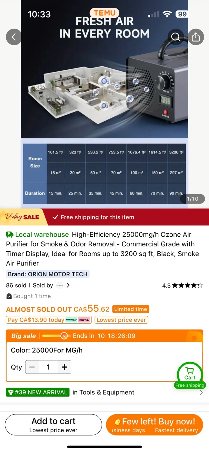 21High-efficiency ozone air purifier. Removes smoke and odours. Suitable for rooms up to 3200 sq ft. Timer display. Black.25000mg/h