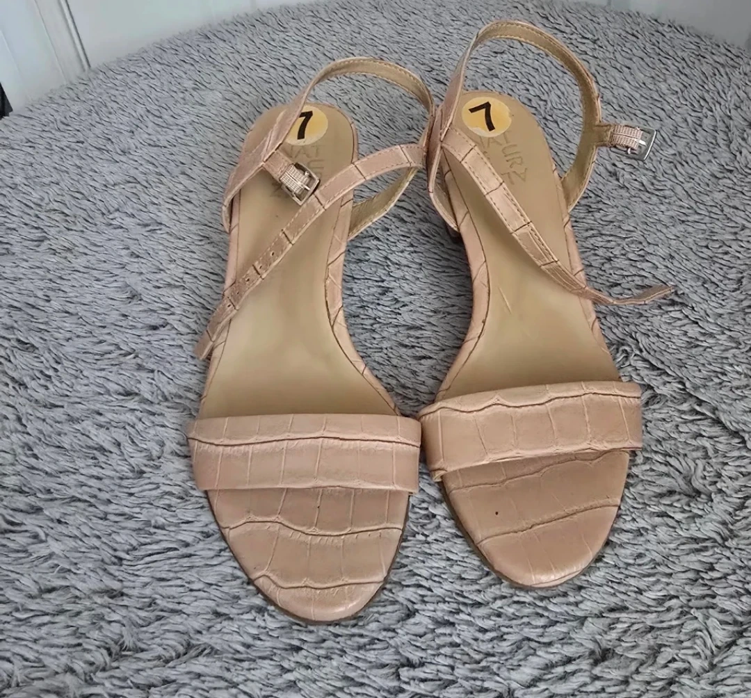 These Naturalizer sandals are a beautiful light pink with a croc embossed texture. They feature a comfortable block heel and an adjustable ankle strap. Size 7.