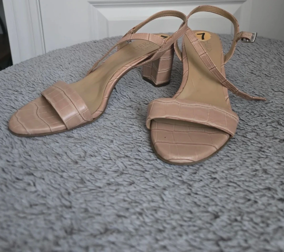 These Naturalizer sandals are a beautiful light pink with a croc embossed texture. They feature a comfortable block heel and an adjustable ankle strap. Size 7.