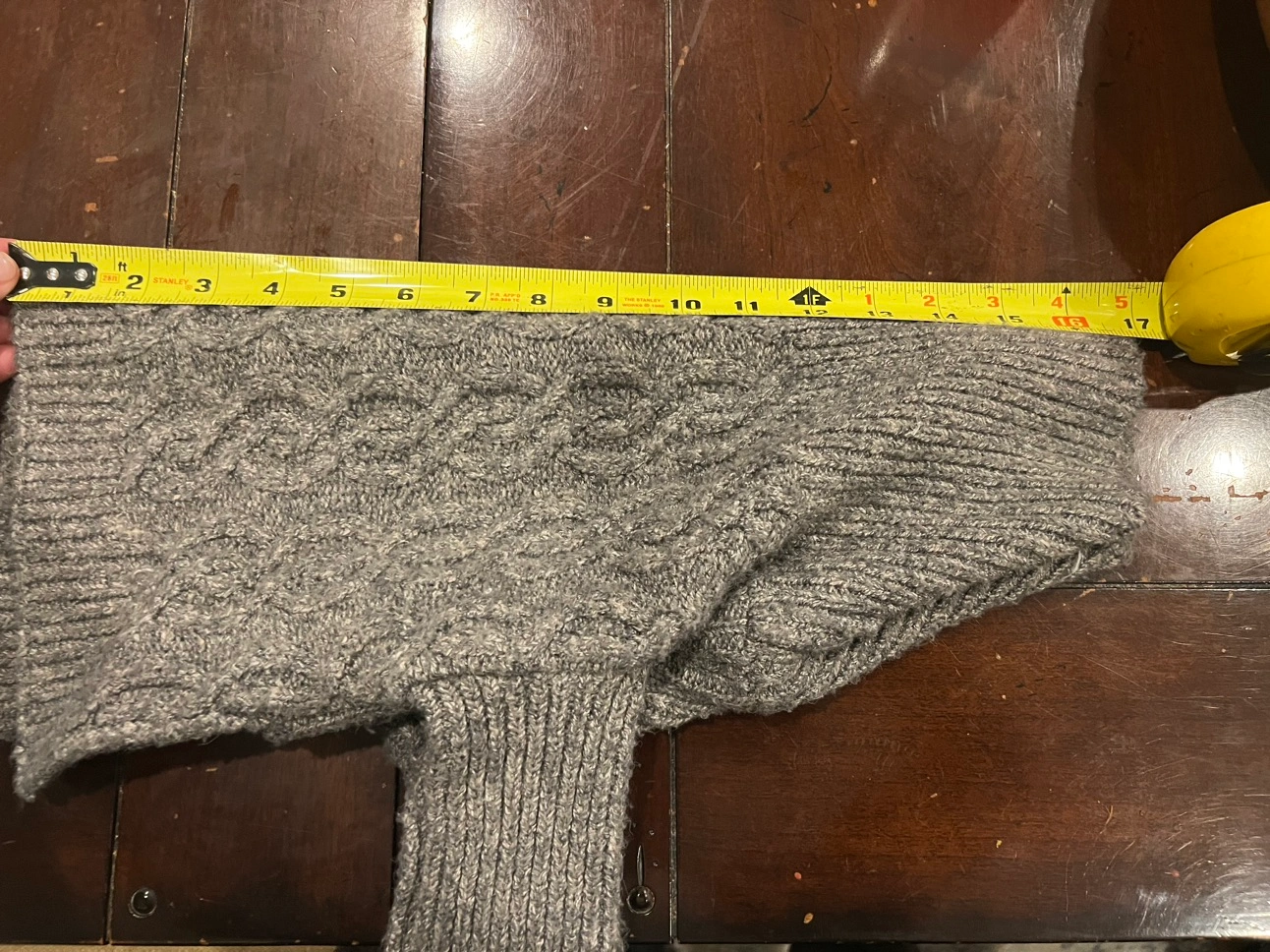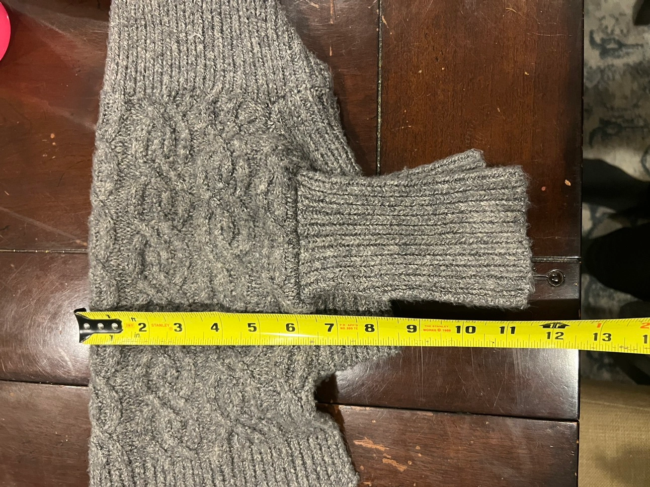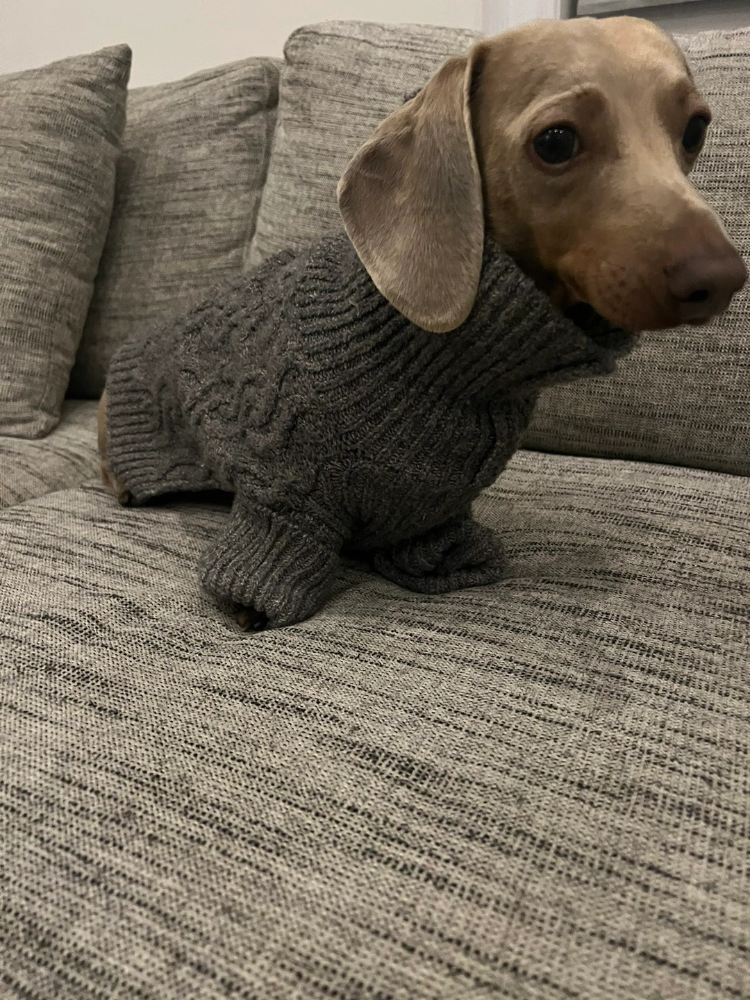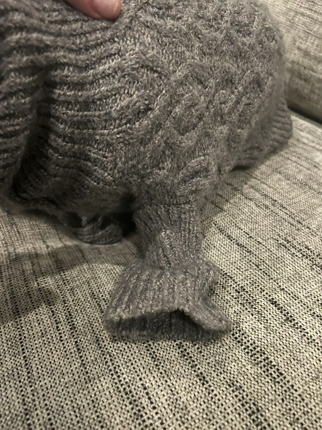 Super soft charcoal grey dog sweater. Tag says size Small. As you can see sleeves are way too long for my Dachshund..measurements seen in pics. I have other dog jackets and sweaters (also leashes and harnesses) that I have not listed yet so please inquire if you need dog items!