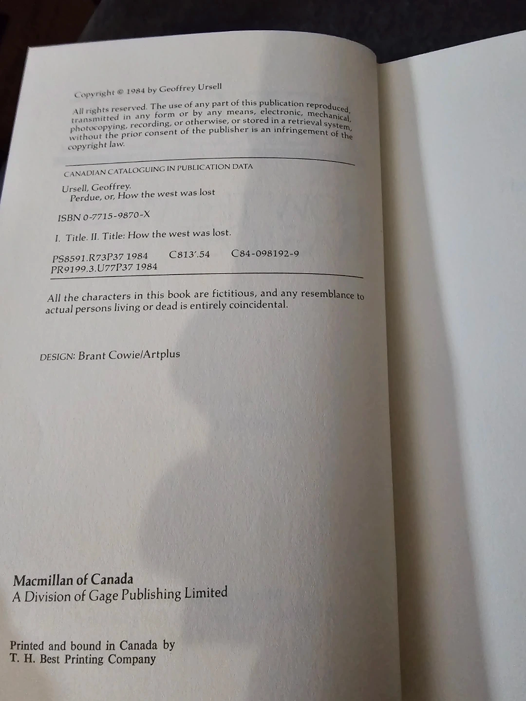 Perdue or How the West Was Lost is a novel by Geoffrey Ursell. This hardcover edition was printed and bound in Canada by T. H. Best Printing Company. Copyright is from 1984.