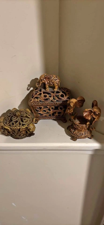 Ornate elephant candle holder and 2 ornate keep sake boxes.