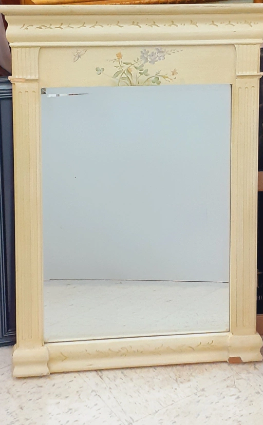 Large ornate mirror with a floral design. The mirror is cream coloured and has a detailed frame. It has a delicate floral pattern with a yellow, green, and purple colour scheme. It has an ornate frame.