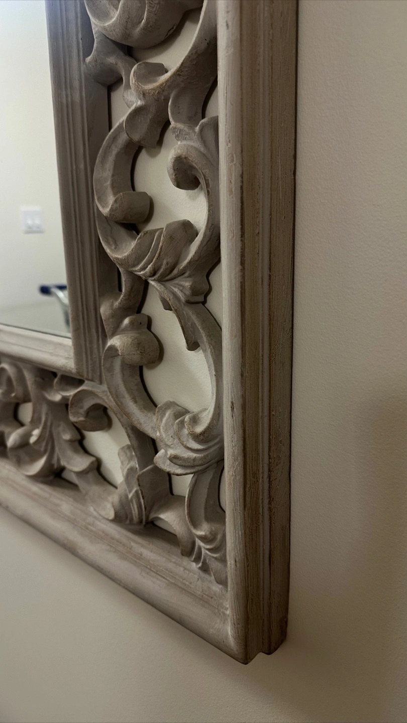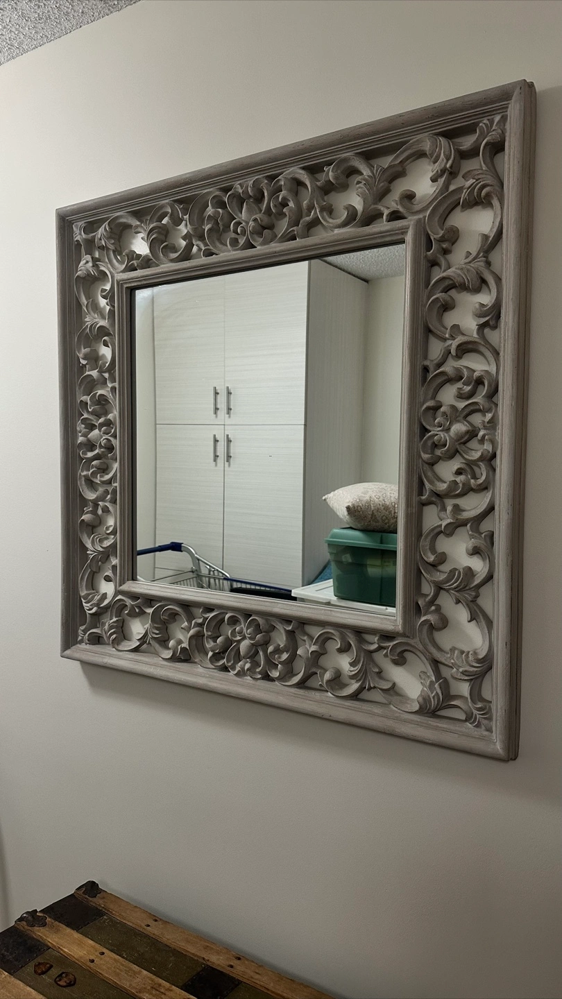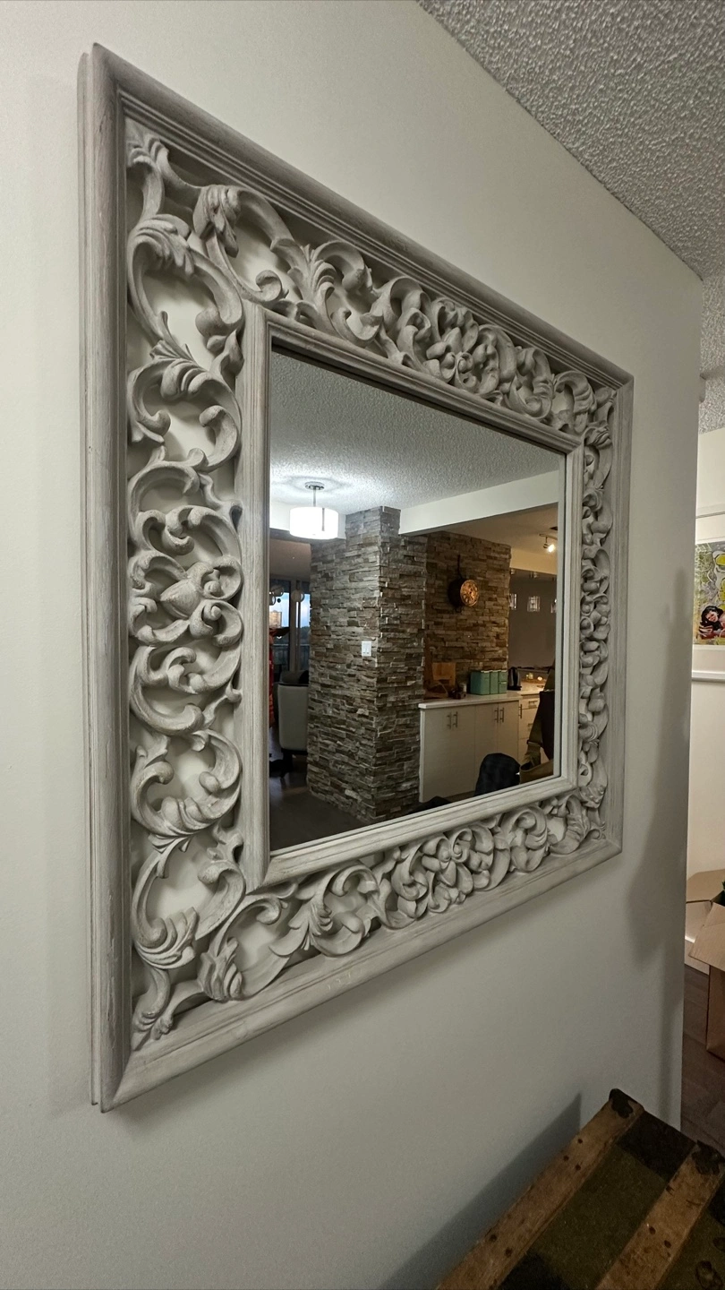 Selling a beautiful ornate framed wall mirror! It's in great condition and would add a touch of elegance to any room. The frame has a lovely, detailed design and a neutral colour that would suit many decor styles. It's ready to hang and brighten up your space 39”x39” Pick up west side or north cash only