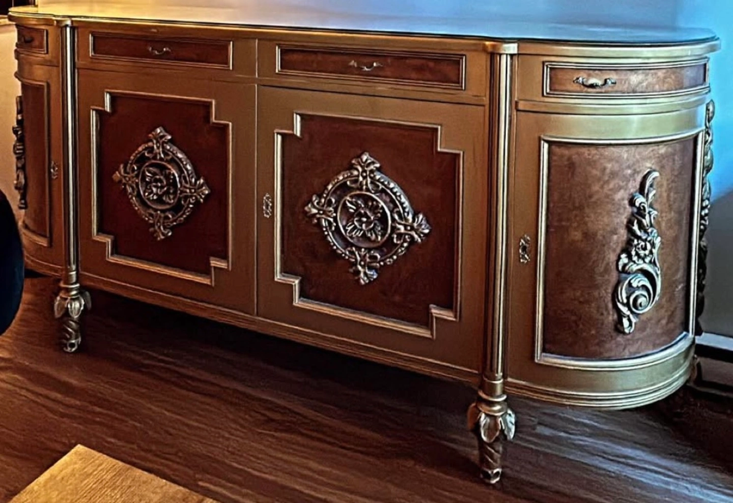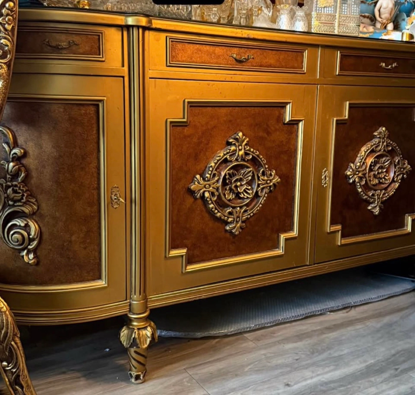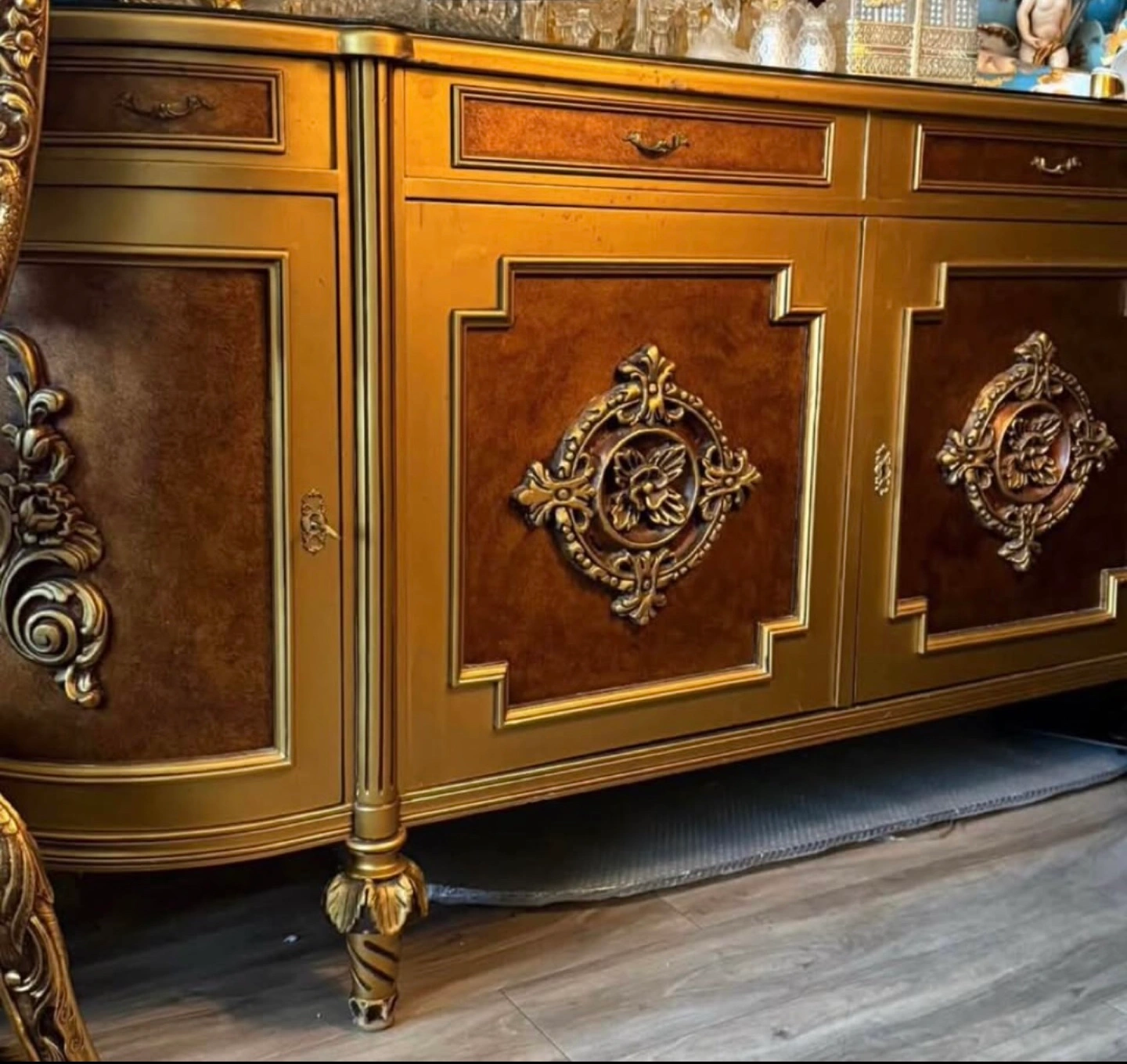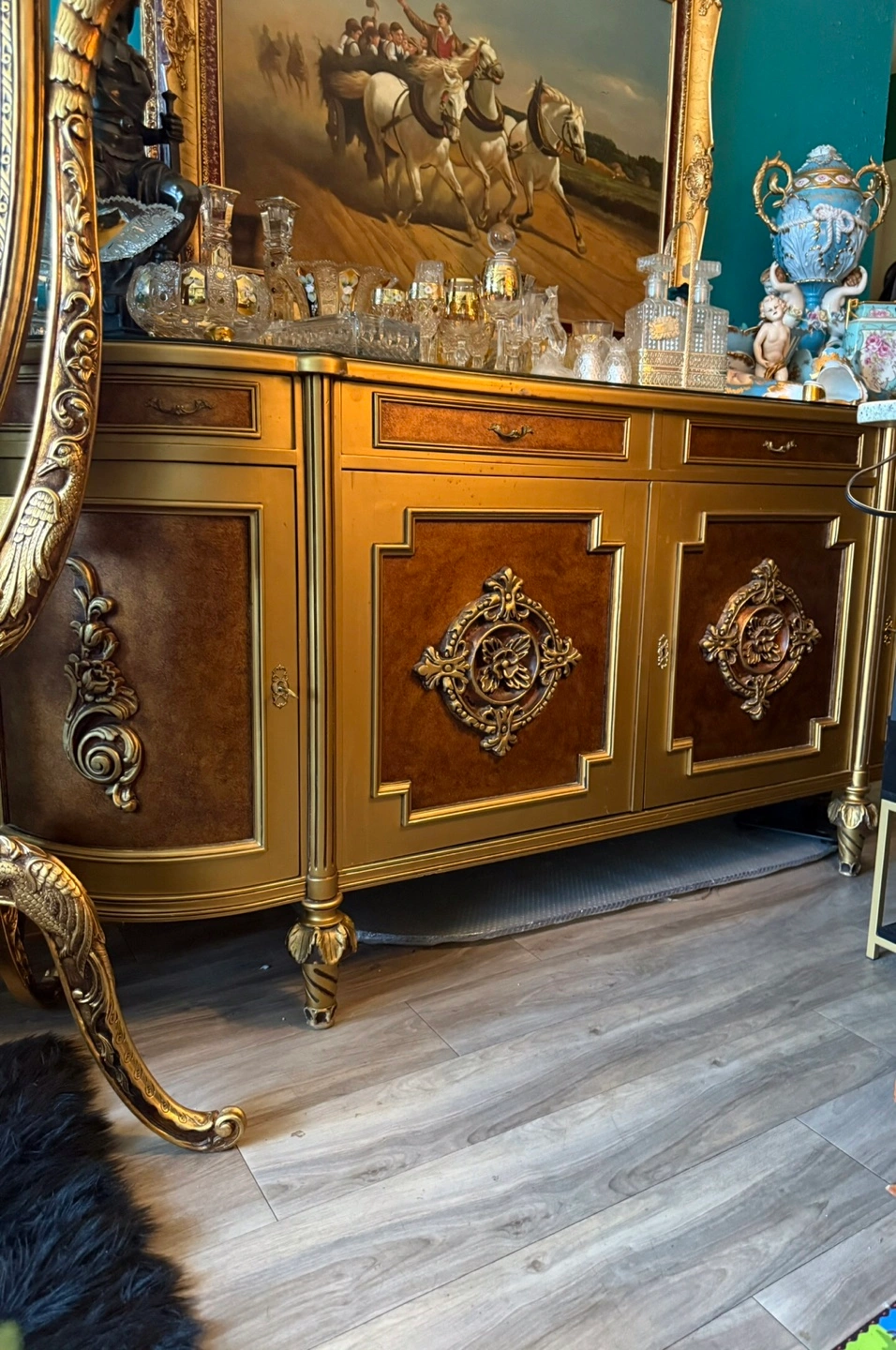 41Selling a beautiful sideboard with ornate gold detailing and a rich brown finish. It's a stunning piece that would add a touch of elegance to any dining or living room. It features drawers and cabinet space for storage. It's in great condition and ready for a new home H: 100cm L:220cm W:55cm