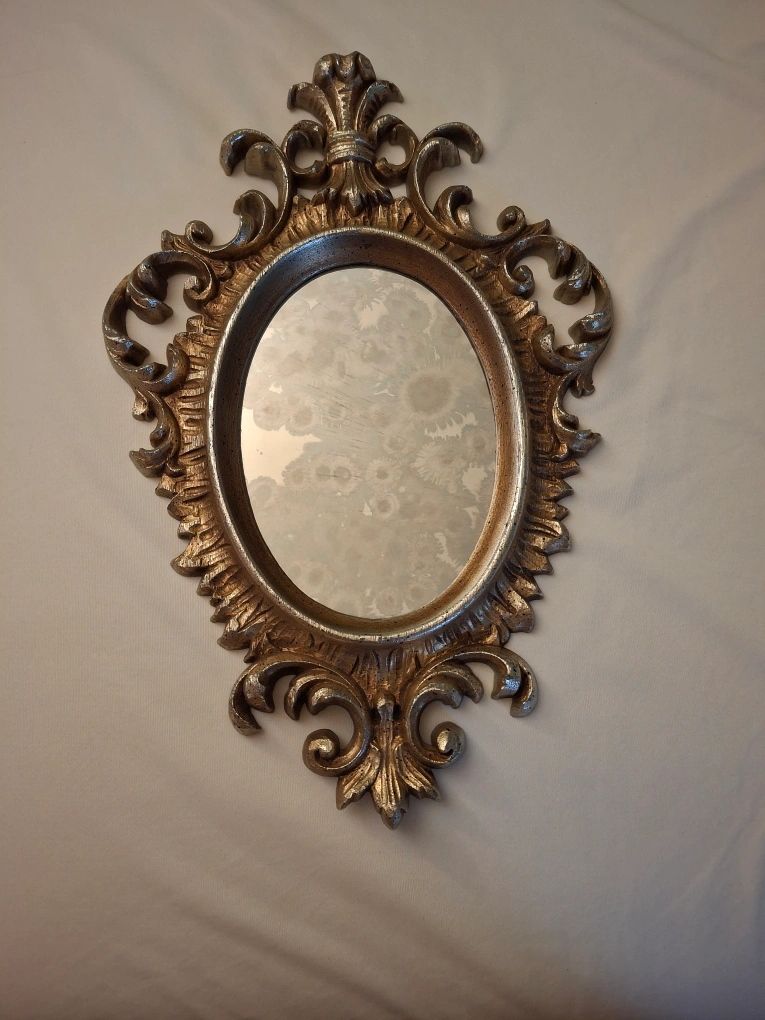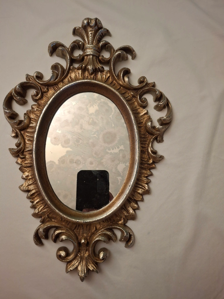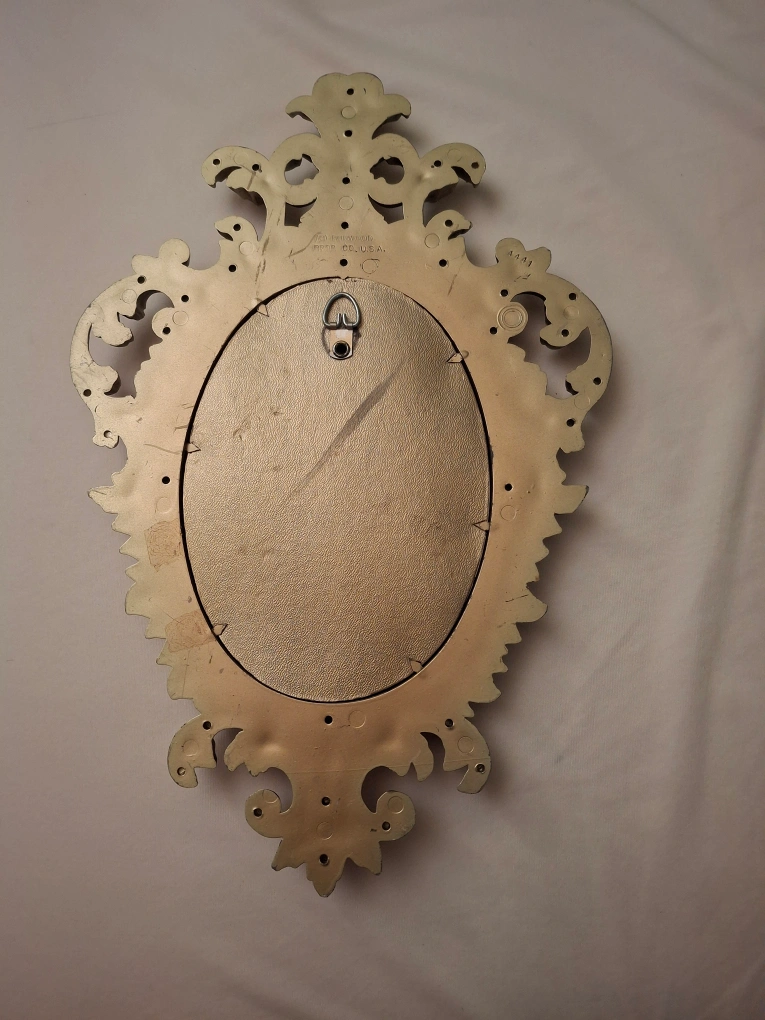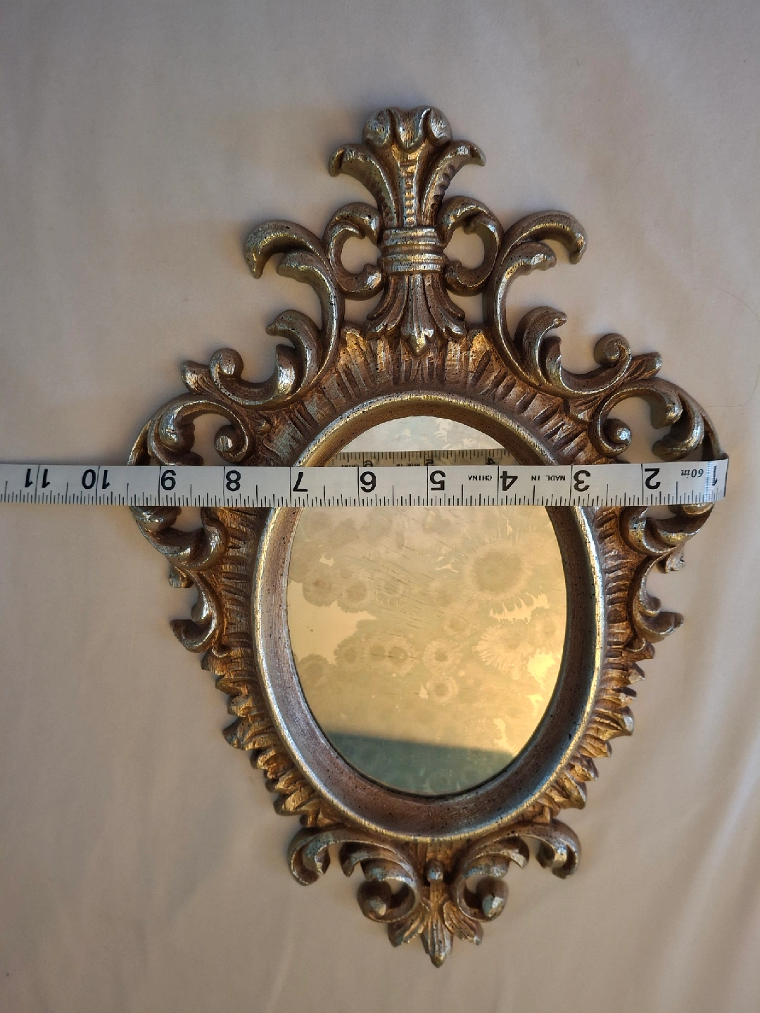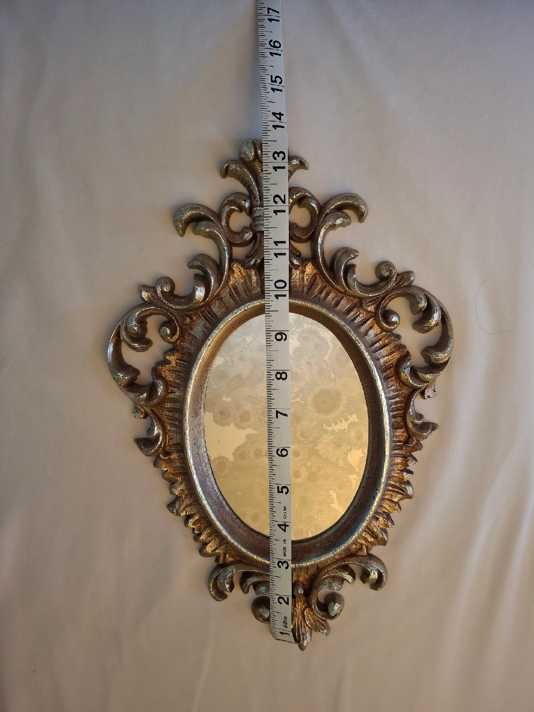 Burnwood Prod. Co. mirror. Beautiful ornate mirror. Gold finish. Oval shape with detailed frame. Perfect for adding a touch of elegance to any room. Wall hanging. The mirror itself is 6.5 x 4.5"
