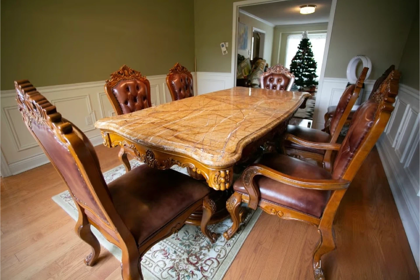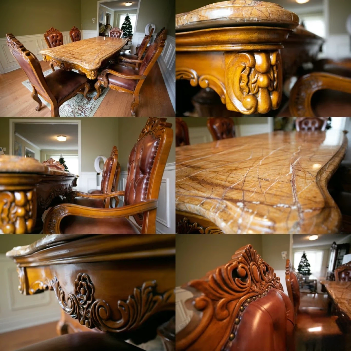 This is a beautiful, ornate dining table set with a marble top and intricately carved wooden chairs. The set includes a large table and six chairs, perfect for family dinners or entertaining guests. The marble top is in excellent condition, and the chairs are sturdy and comfortable. It's a statement piece that will add elegance to any dining room