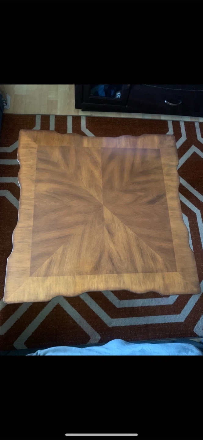 73Selling a lovely ornate wooden coffee table. It has some beautiful detailing on the legs and edges. There is a small chip on the top surface, as shown in the photos, but otherwise it's in good condition. Perfect for adding a touch of elegance to your living room! 30 by 30 and height 27 inches $70 Barton and Gage area