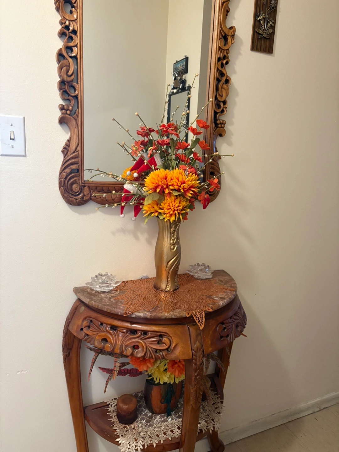 Selling a lovely ornate wooden console table with a matching mirror. It's a beautiful set that would add a touch of elegance to any entryway or living space! The table features intricate carvings and a marble-look top. The mirror complements the table perfectly with its matching wooden frame and ornate details