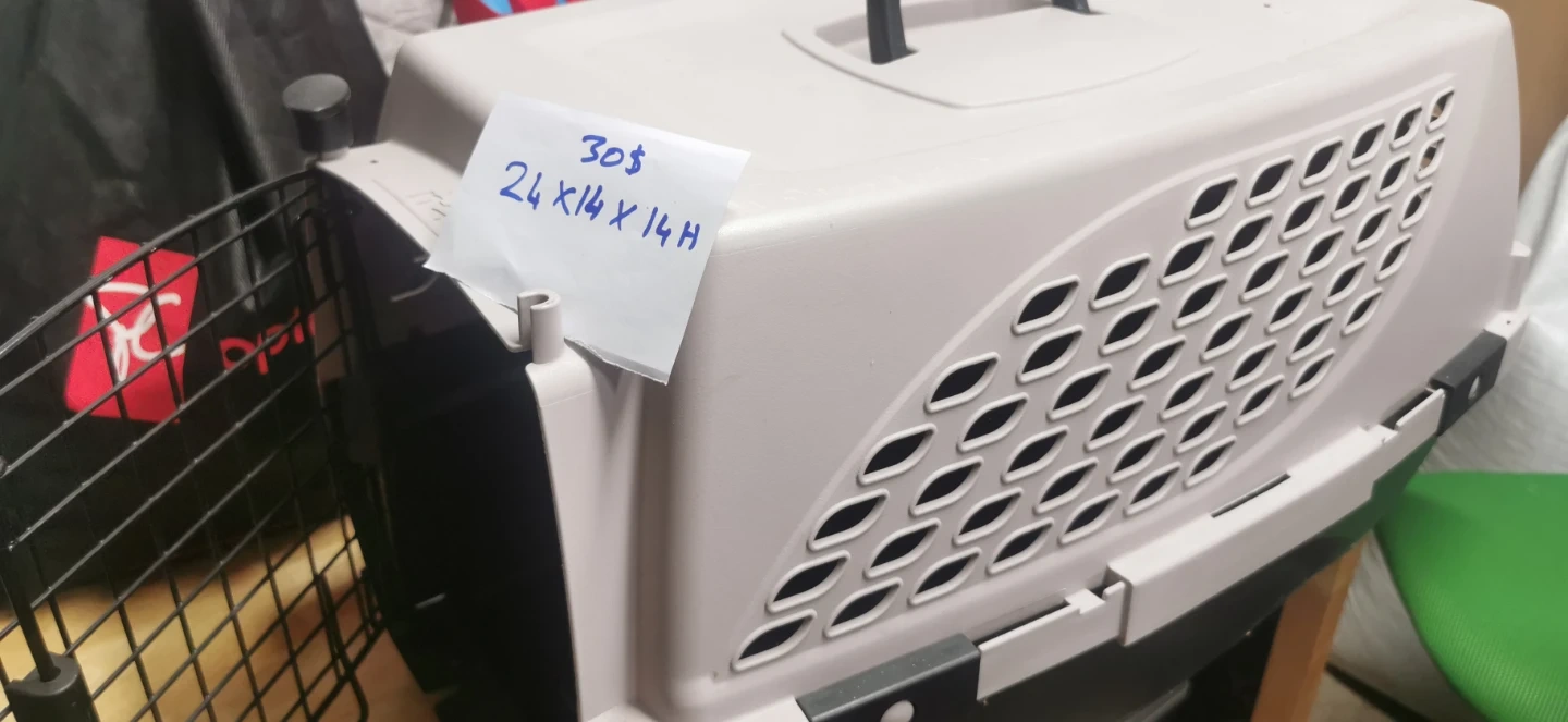 Used pet carrier, perfect for small to medium-sized pets. It's a sturdy plastic construction with ventilation slots on the sides and front. Includes a wire door for secure access. Dimensions are 24 inches long, 14 inches wide, and 14 inches high. Ideal for travel or vet visits!