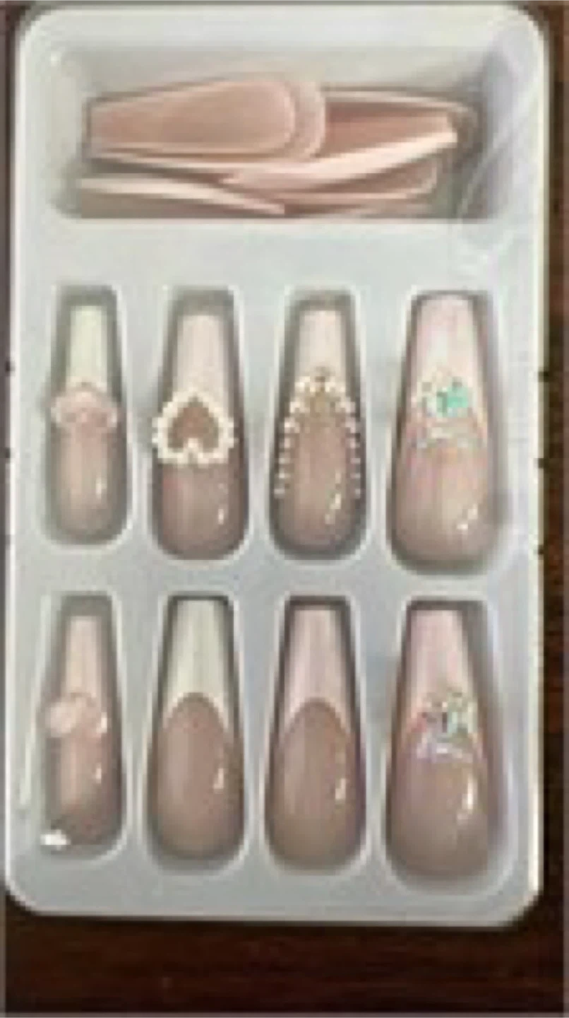 Set of assorted press-on nails, featuring various decorative designs like pearls and hearts. These nails come in a neutral tone with French tip accents and embellishments. Includes multiple sizes for a customized fit.