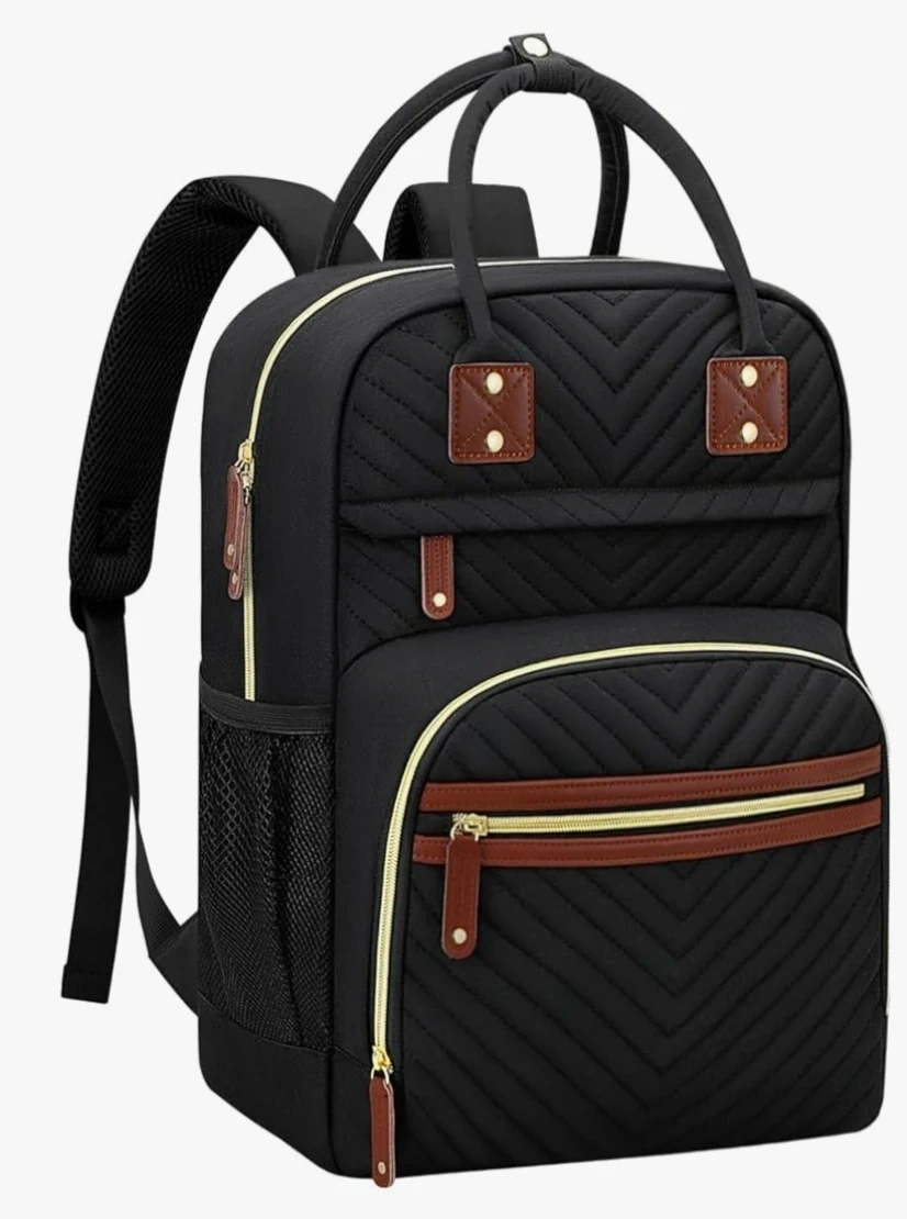 This diaper bag backpack is black with chevron stitching and faux leather accents. It features aluminum insulated pockets designed to maintain warm or cold for 2-4 hours. It also includes a 100% leak-proof zipper pocket for storing wet or dirty items.