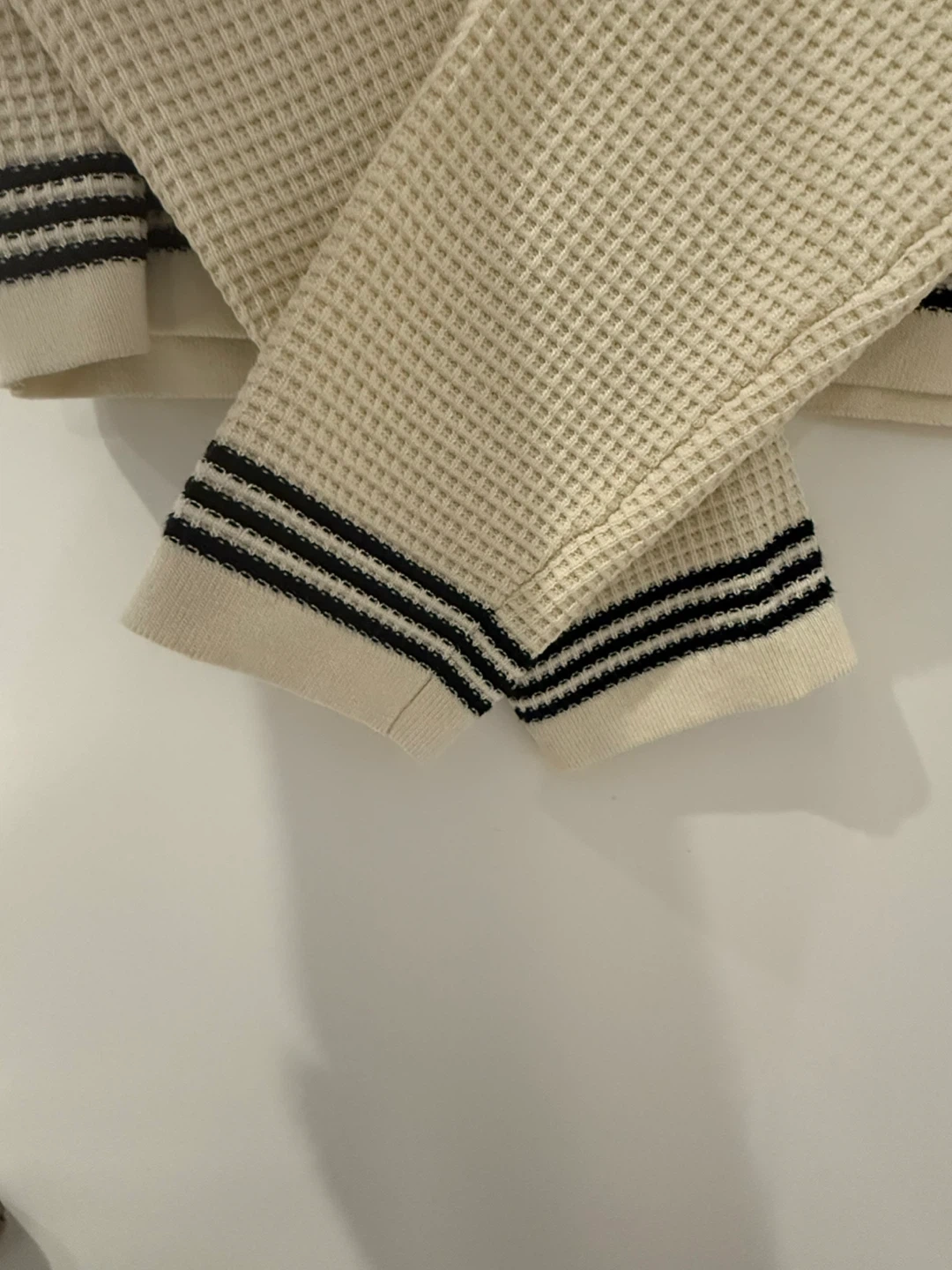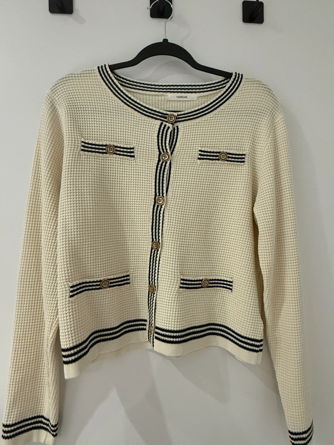 Ivory Chanel-style cropped knit jacket with black trim and gold buttons. Bought it from korean department store. Only worn a few times (less than 3 times)