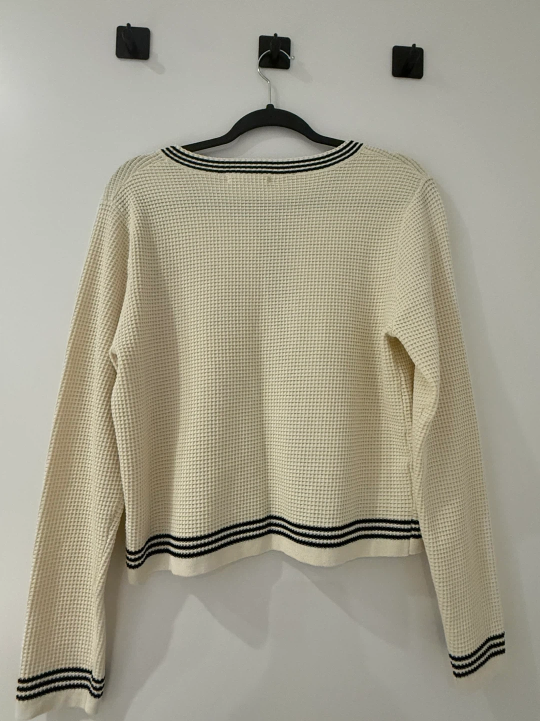 Ivory Chanel-style cropped knit jacket with black trim and gold buttons. Bought it from korean department store. Only worn a few times (less than 3 times)