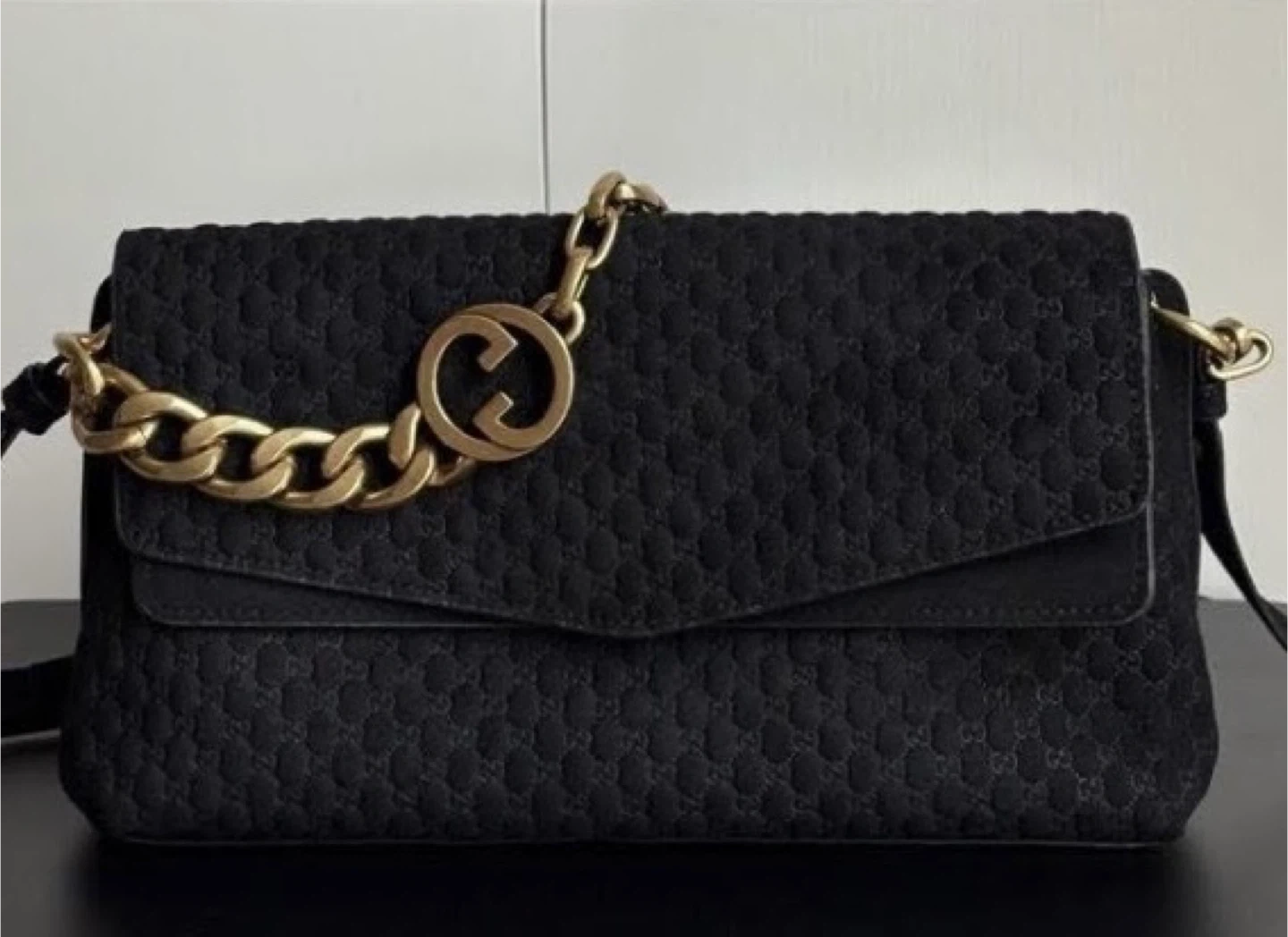 Suede shoulder bag with signature GG logo hardware and a chunky gold chain strap. It has an adjustable leather shoulder strap as well. This bag's flap closure opens to a fabric-lined interior.