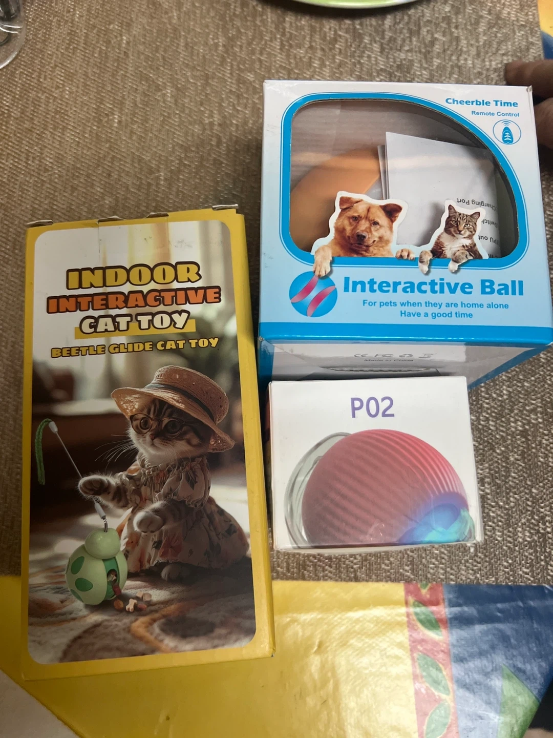 Selling a couple of fun interactive cat toys! There's an indoor interactive beetle glide cat toy and a Cheerble Time interactive ball with remote control. Both are designed to keep your furry friends entertained when they're home alone. The interactive ball is described as helping pets have a good time! $30 for all the three.
