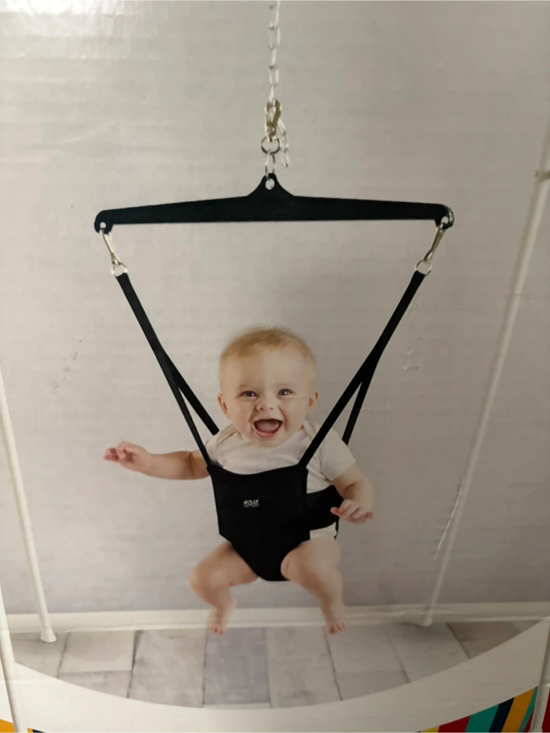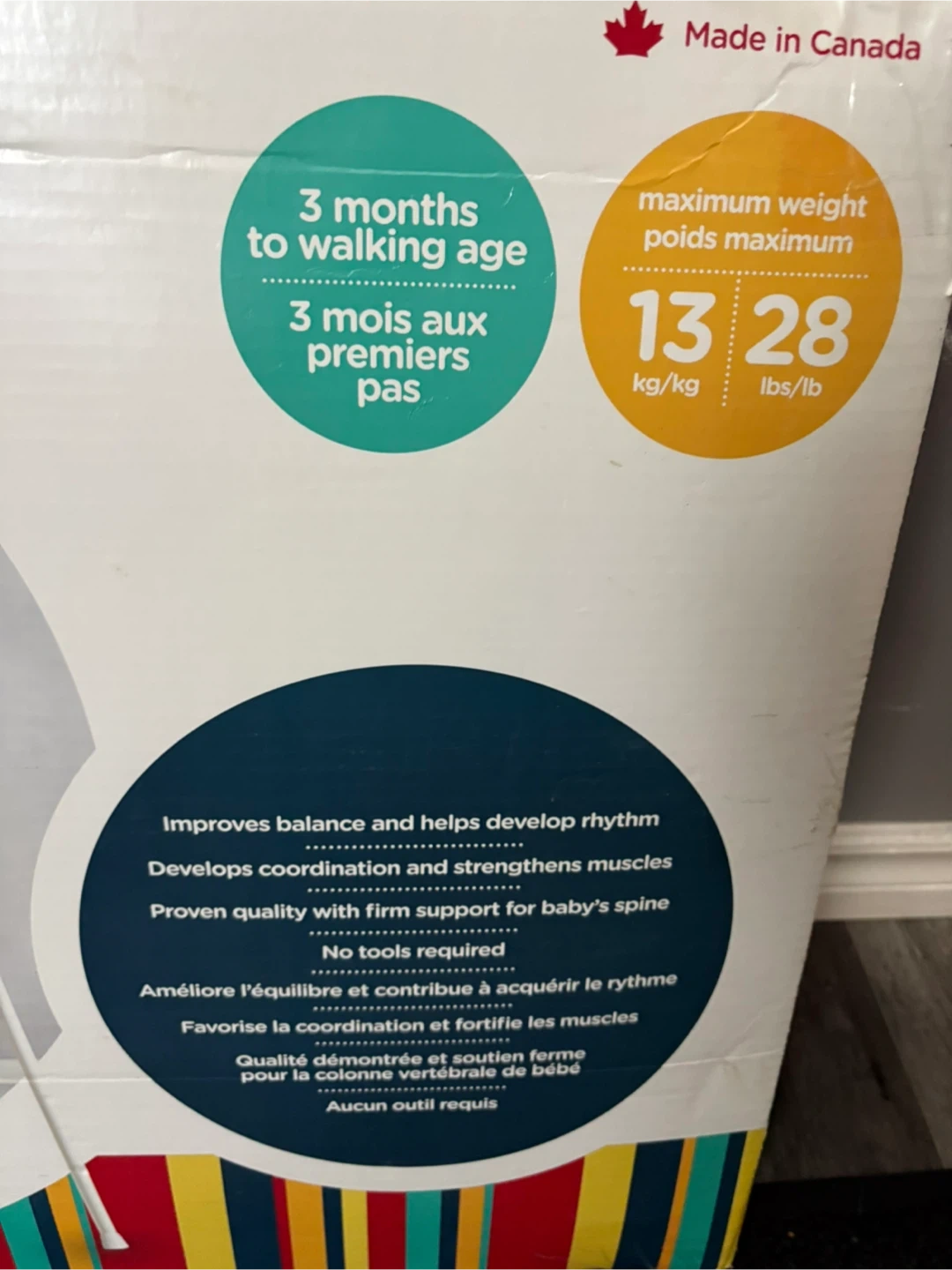 The Jolly Jumper with portable stand is perfect for babies from 3 months to walking age! It helps improve balance and develop rhythm, plus it develops coordination and strengthens muscles. It's been used in hospitals and homes around the world for over 70 years. The maximum weight is 28 lbs. Folds flat for easy storage and comes with the box