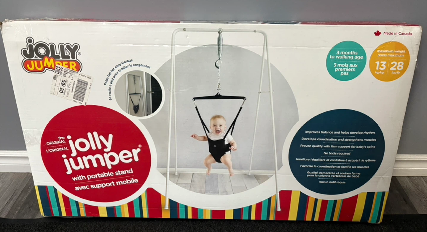 The Jolly Jumper with portable stand is perfect for babies from 3 months to walking age! It helps improve balance and develop rhythm, plus it develops coordination and strengthens muscles. It's been used in hospitals and homes around the world for over 70 years. The maximum weight is 28 lbs. Folds flat for easy storage and comes with the box