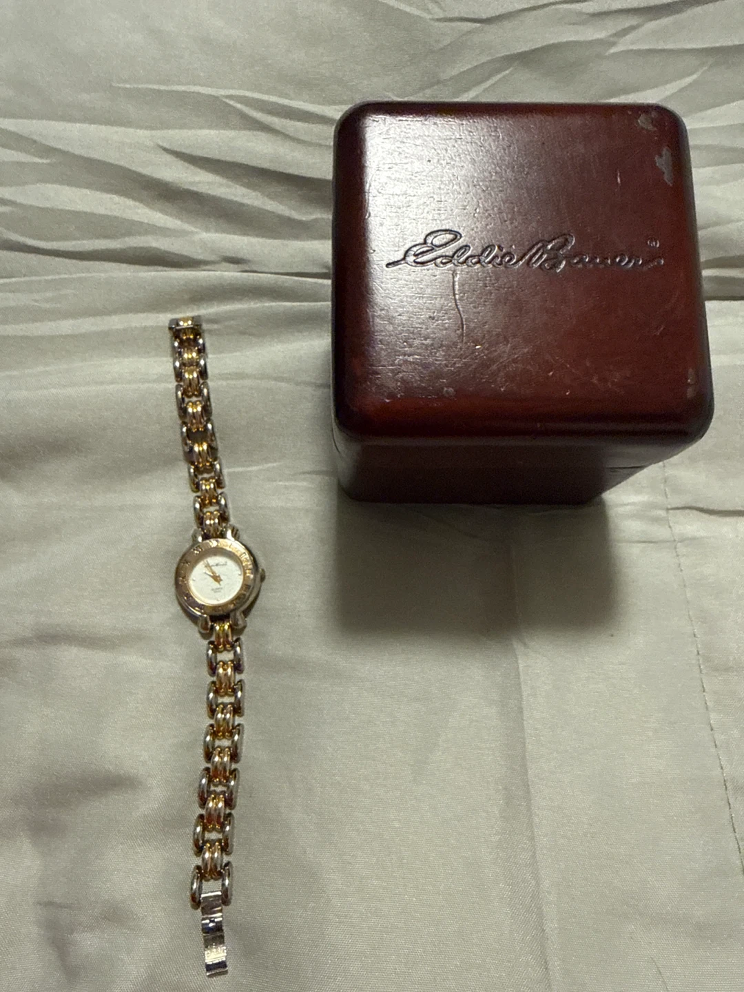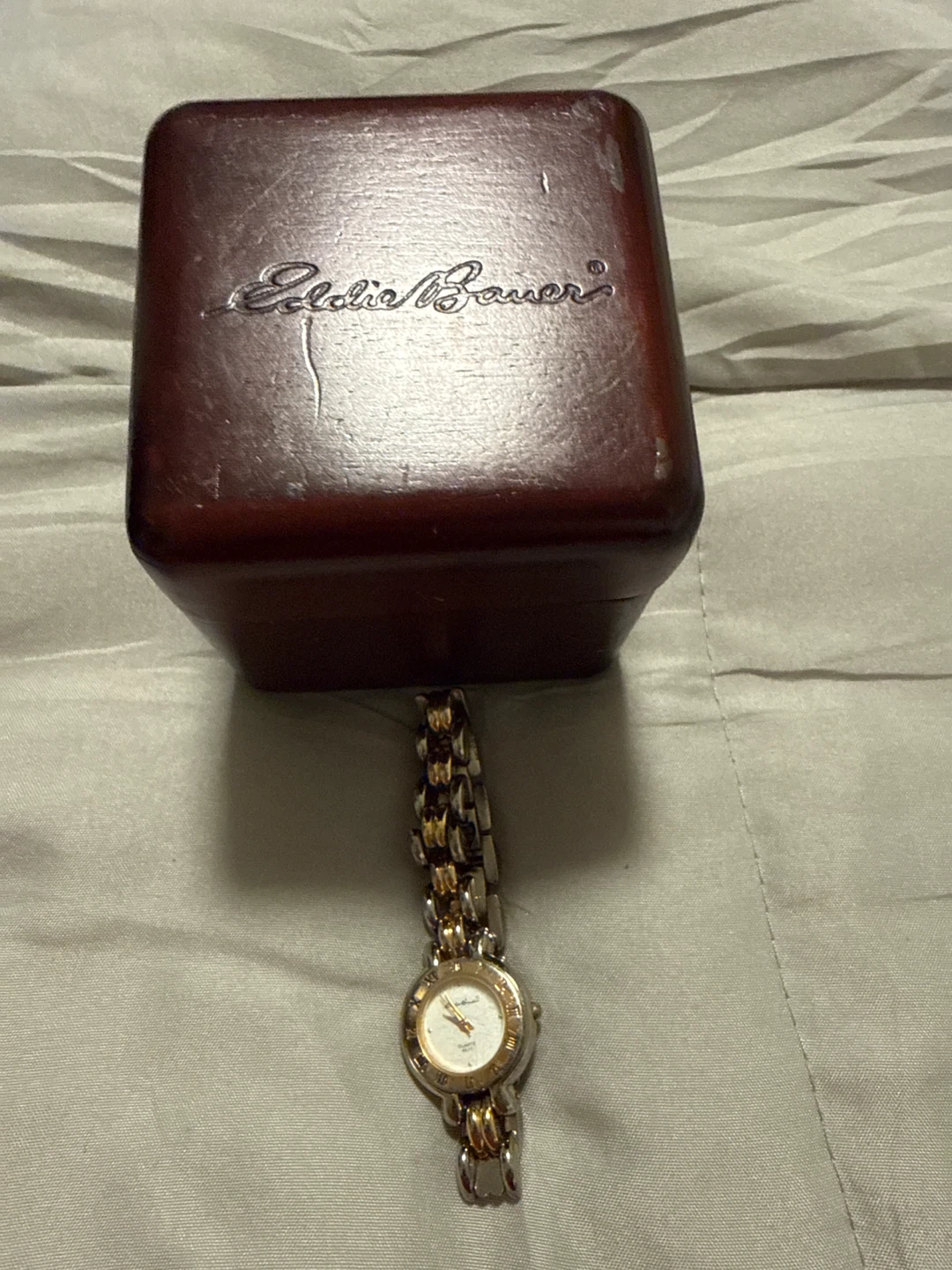 Selling a lovely Eddie Bauer ladies watch. It features a two-tone design (gold and silver) and comes with its original box! It's in great condition and would make a wonderful addition to any collection