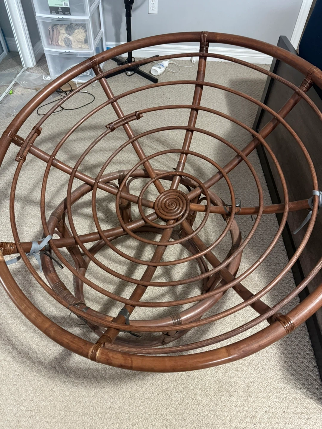 Round rattan papasan chair frame with a plush grey cushion. This chair is made from bamboo and has a natural wood finish. It's super comfy!