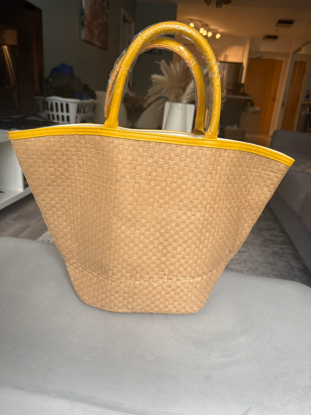 Woven bag with bright yellow handles and trim. Interior looks lined. Would make a great beach bag, summer tote, picnics, etc