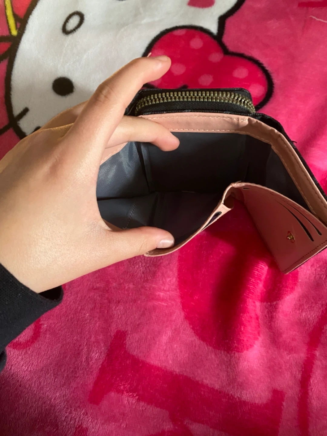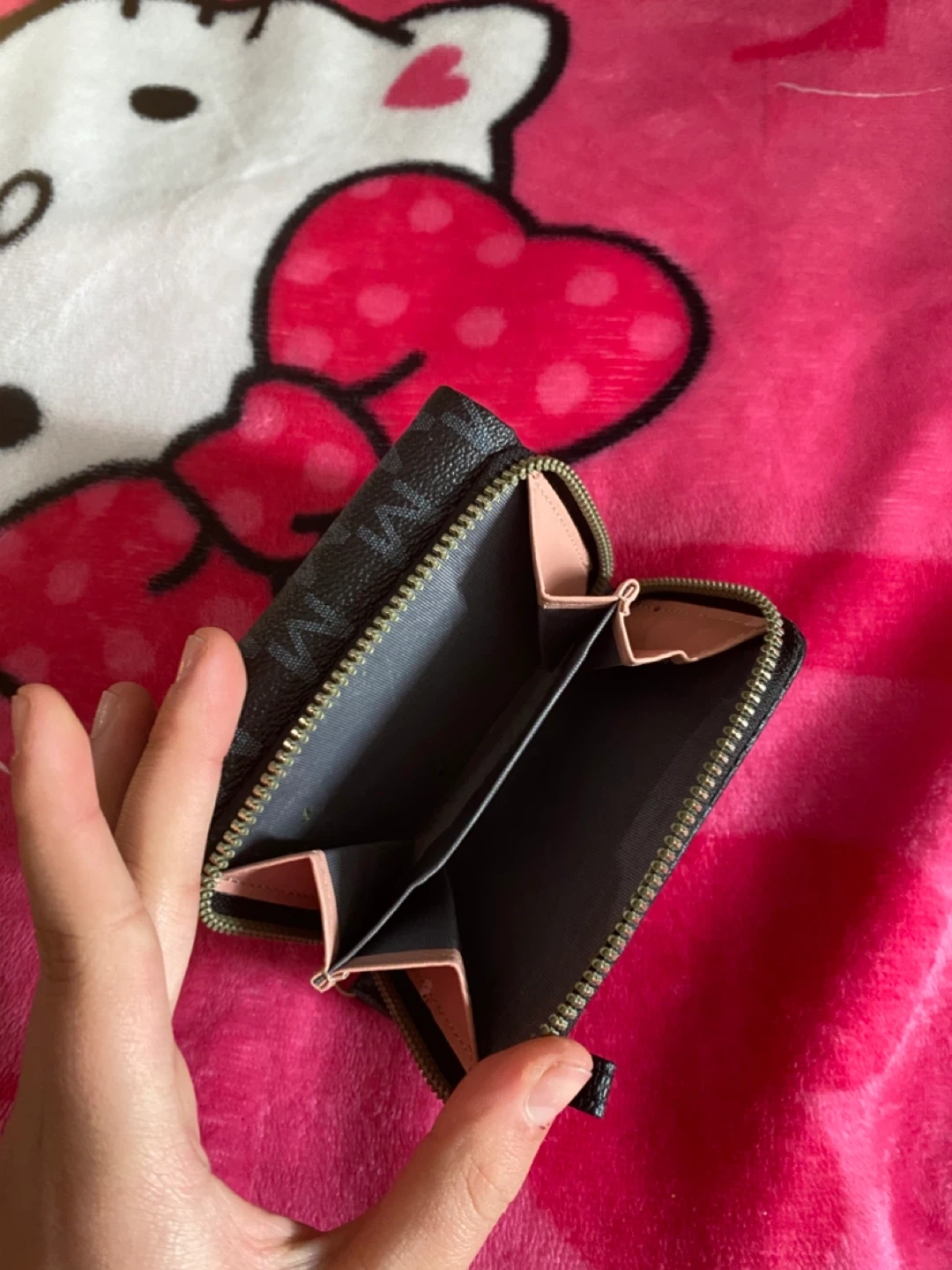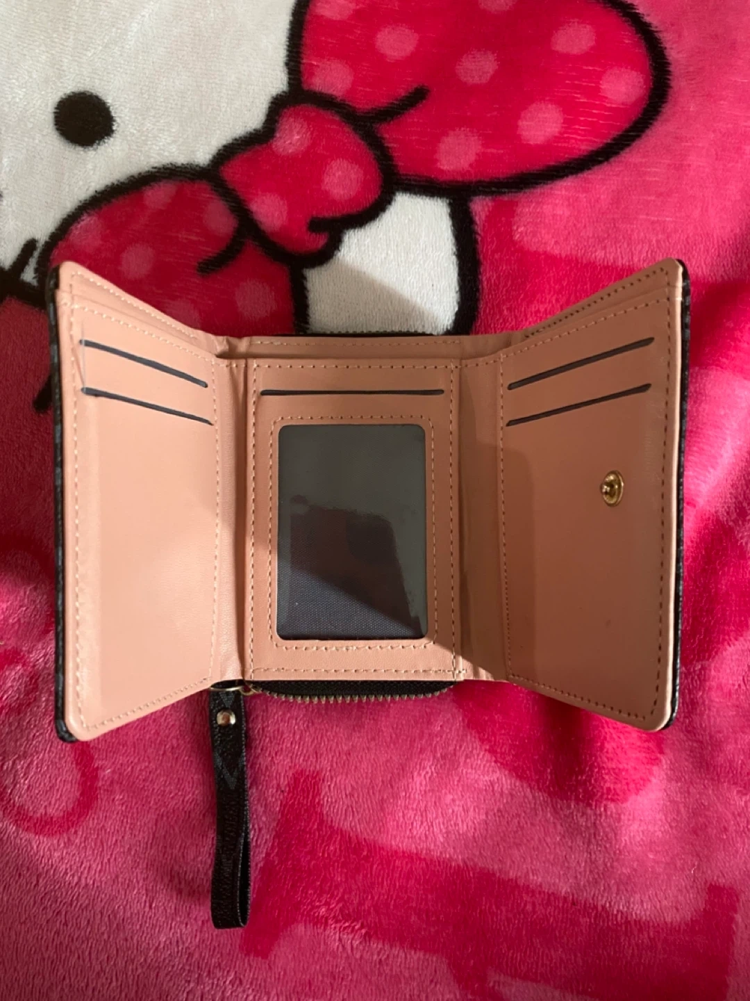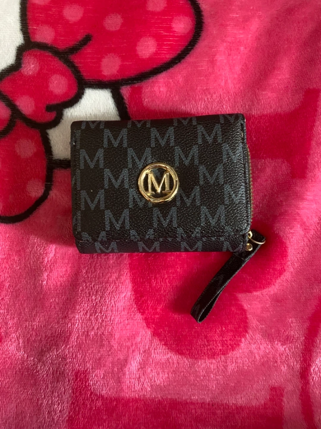 A small tri-fold wallet with a zip-around closure. It has multiple card slots and a coin pocket. Made from faux leather material.