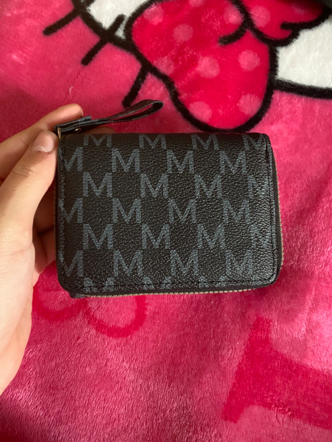 A small tri-fold wallet with a zip-around closure. It has multiple card slots and a coin pocket. Made from faux leather material.