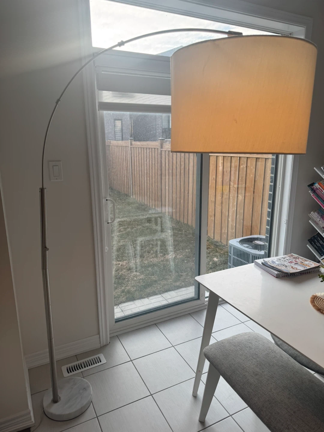 Stylish arc floor lamp featuring a brushed nickel finish and a weighted marble base. It's perfect for adding ambient lighting to living rooms or reading nooks. The lamp includes a large, neutral-toned shade.