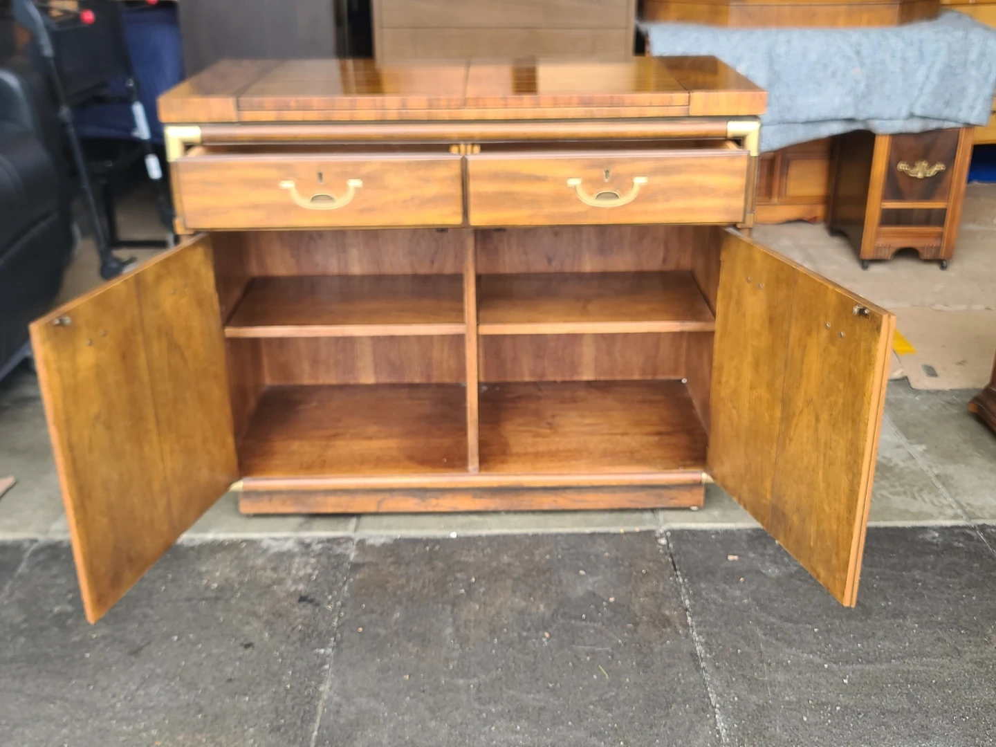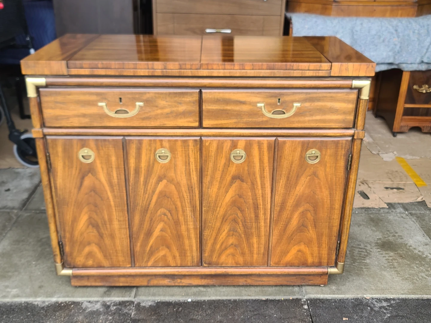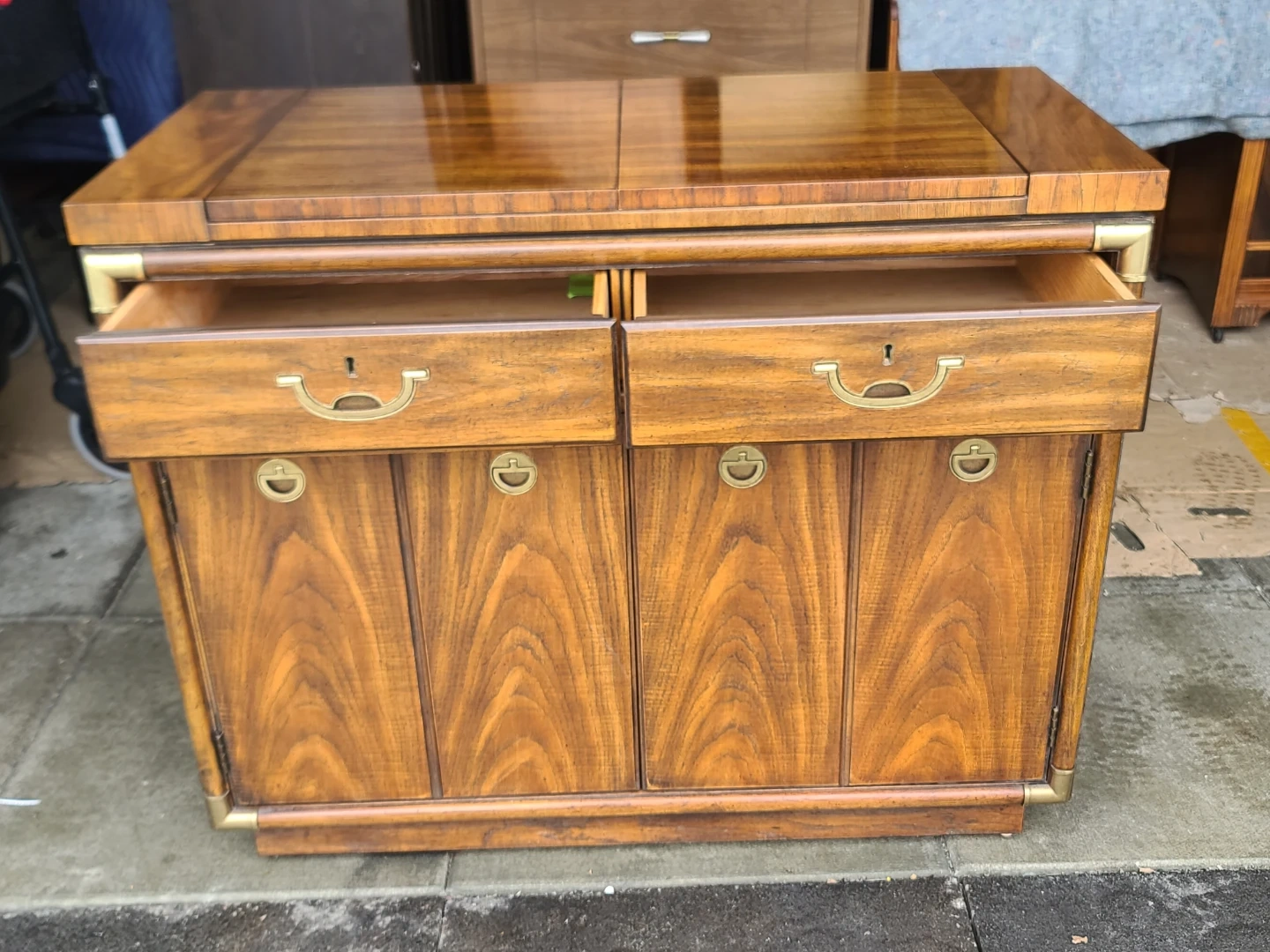 Classic wood bar cabinet. Has campaign style brass hardware and corner accents. Two drawers on top for storage. Two cabinet doors below open to reveal shelves inside. Top expands for extra serving space. It's a sturdy piece that would be great for a dining room or living area. Measurements: W 40" X D 20" X H 33". Delivery can be arranged. Viewing and pickup by appointment.