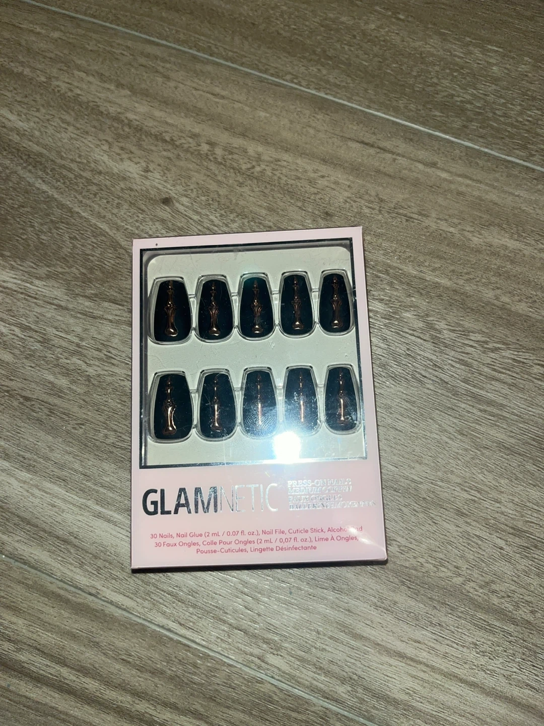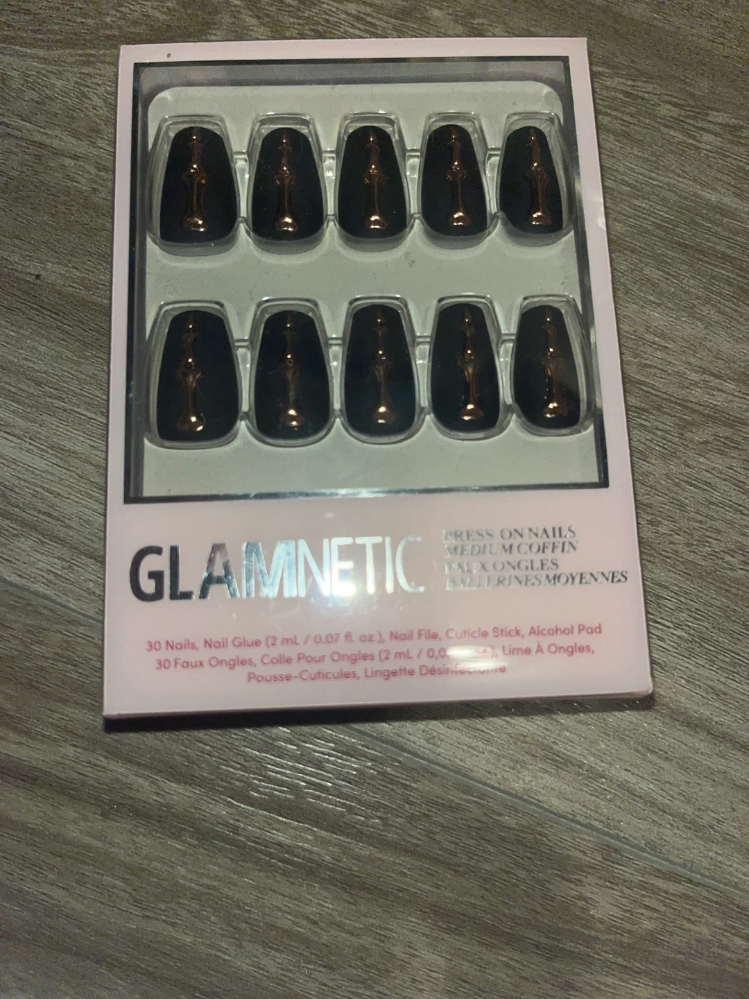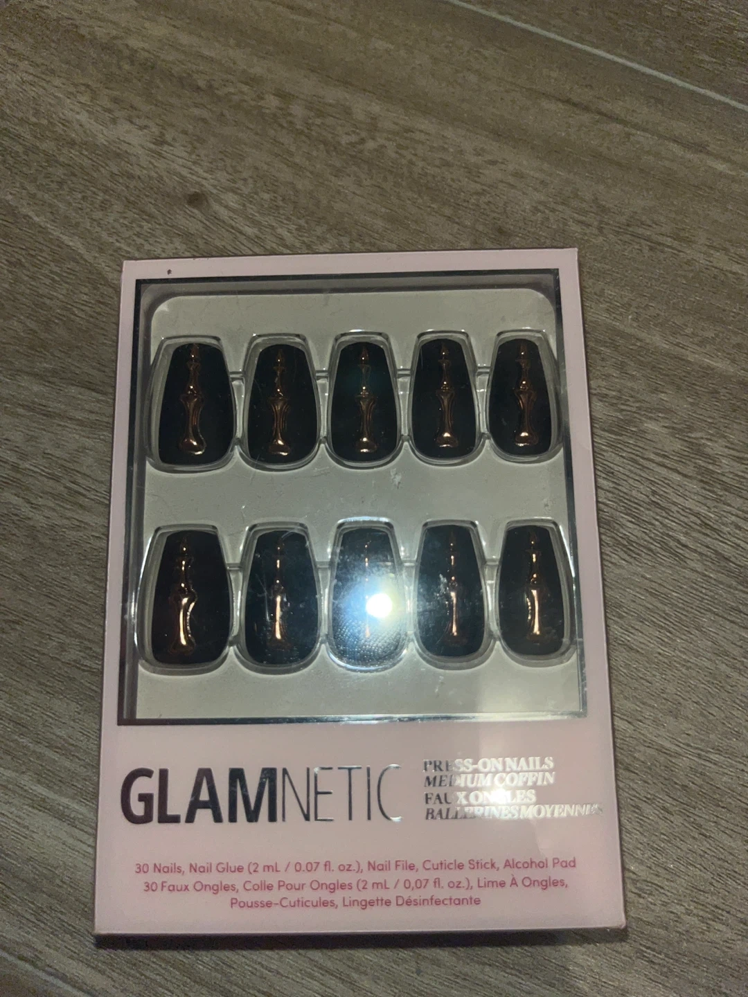 This set includes 30 press-on nails, nail glue, a nail file, cuticle stick, and an alcohol pad. They are medium coffin shaped. Great for a quick manicure!