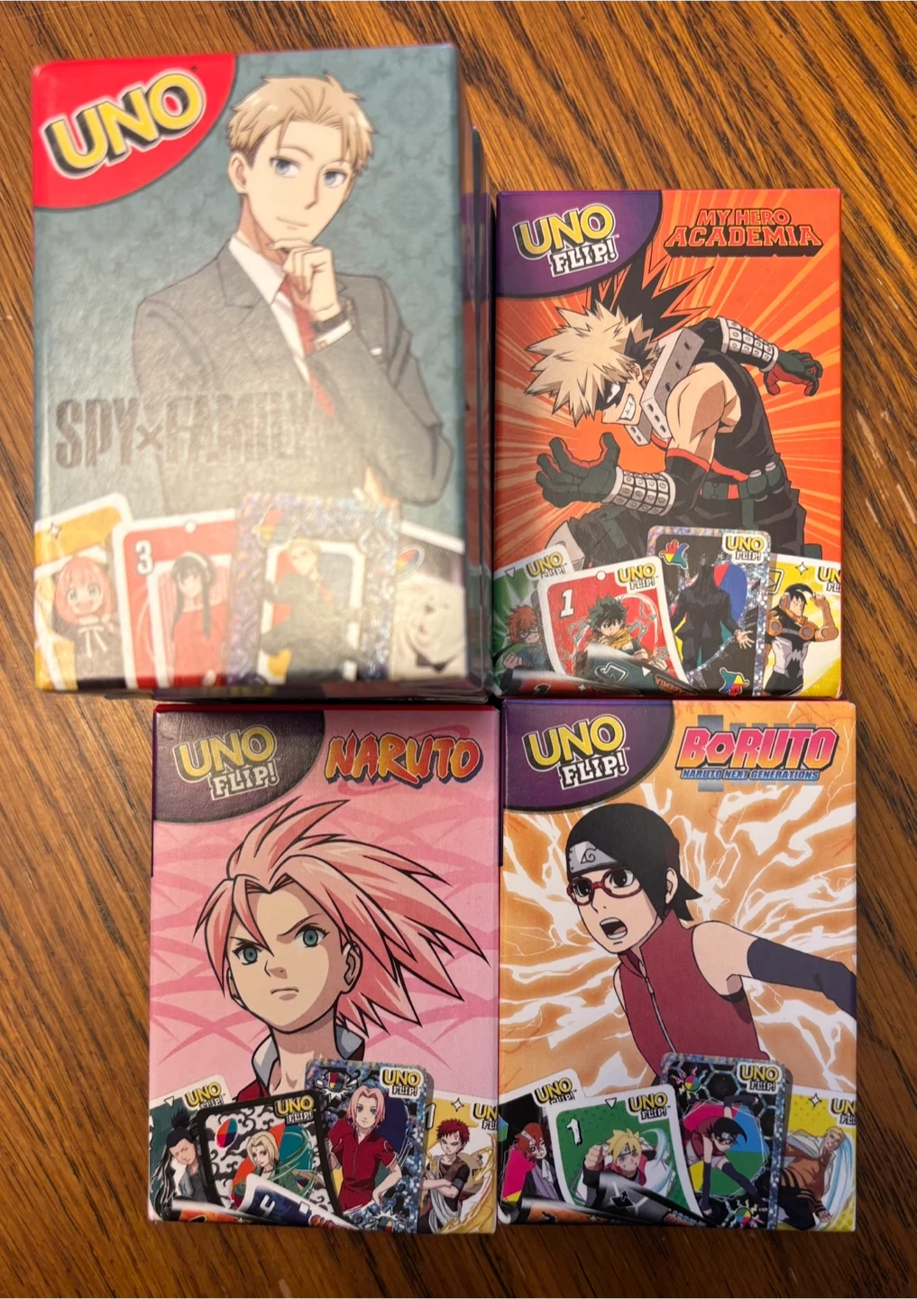 UNO Flip! card game collection featuring Spy x Family, My Hero Academia, Naruto, and Boruto themes. Great for anime fans and card game enthusiasts. Play with friends and family! $2 each, 6 available 😊