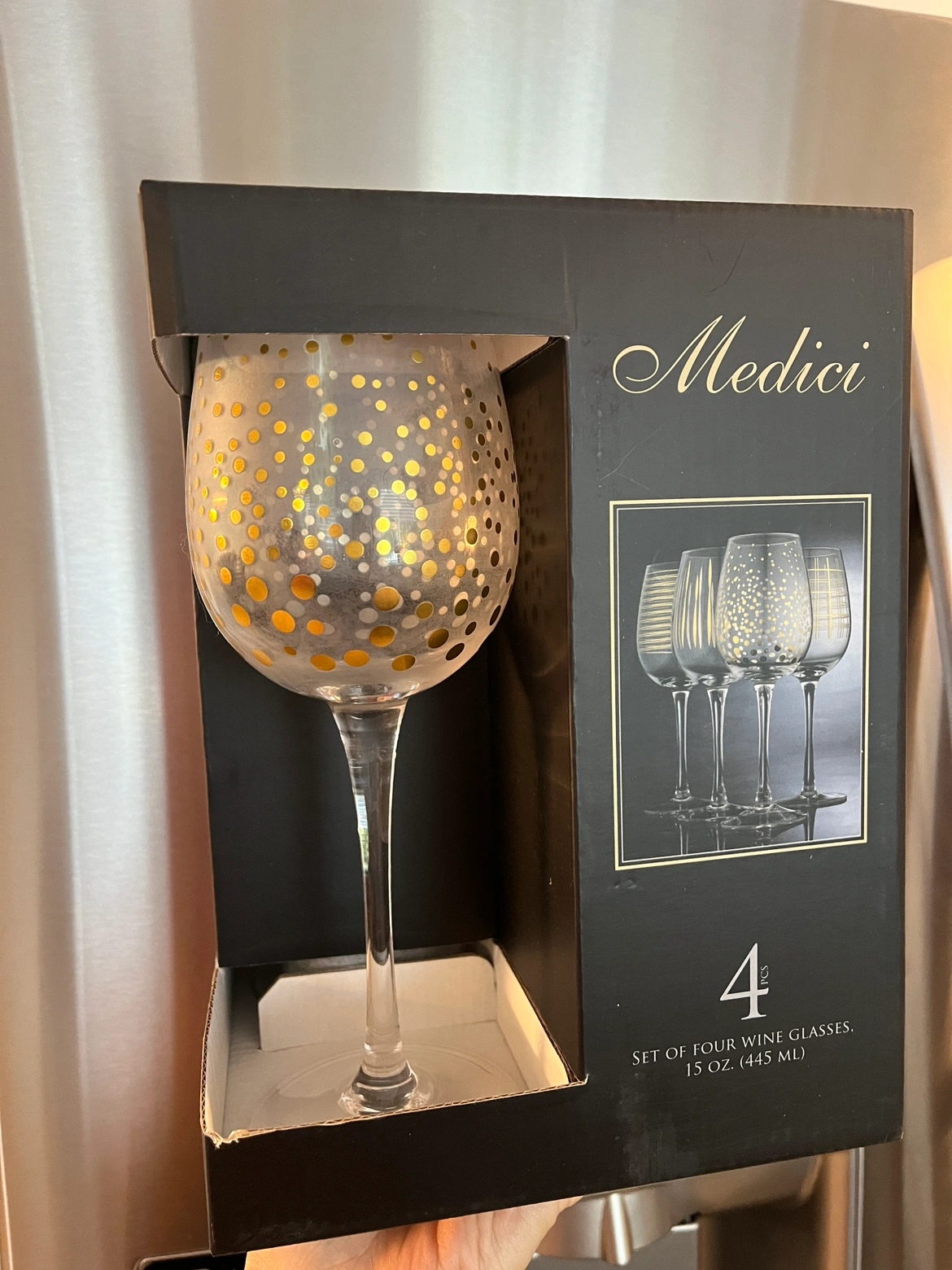 Set of four 15 oz wine glasses. Each glass features a gold and white polka dot design. The glasses are in their original box.
