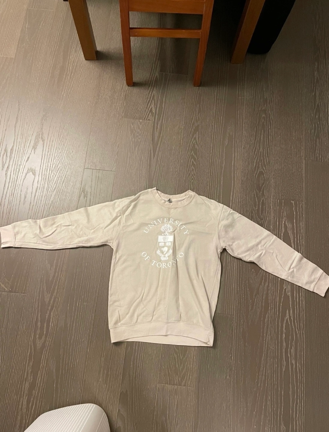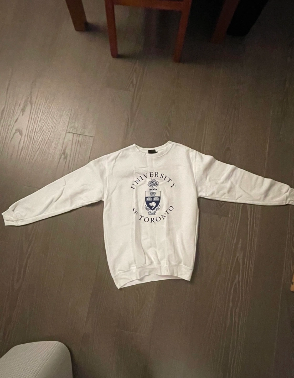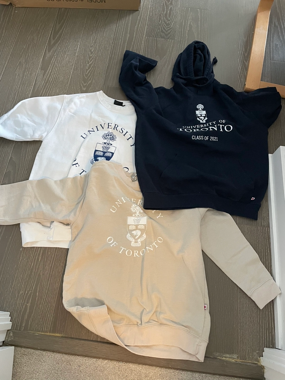 Bundle includes two University of Toronto sweatshirts and one hoodie. One cream-coloured crewneck sweatshirt, one white crewneck sweatshirt, and one navy blue hoodie. All feature University of Toronto logo. One hoodie indicates Class of 2021.
