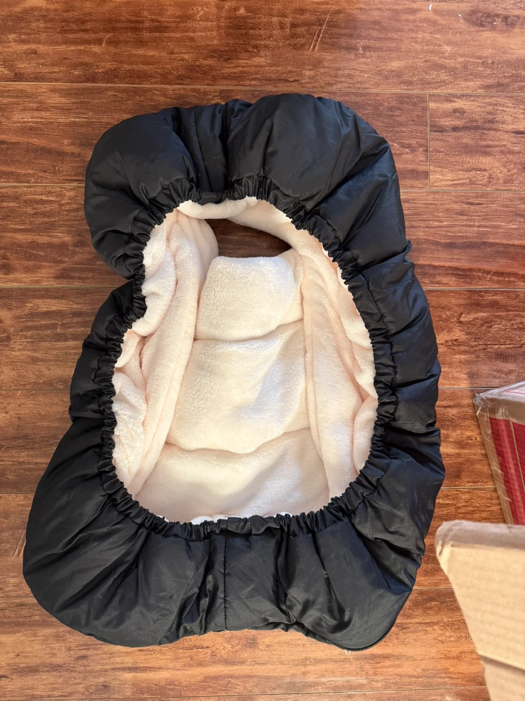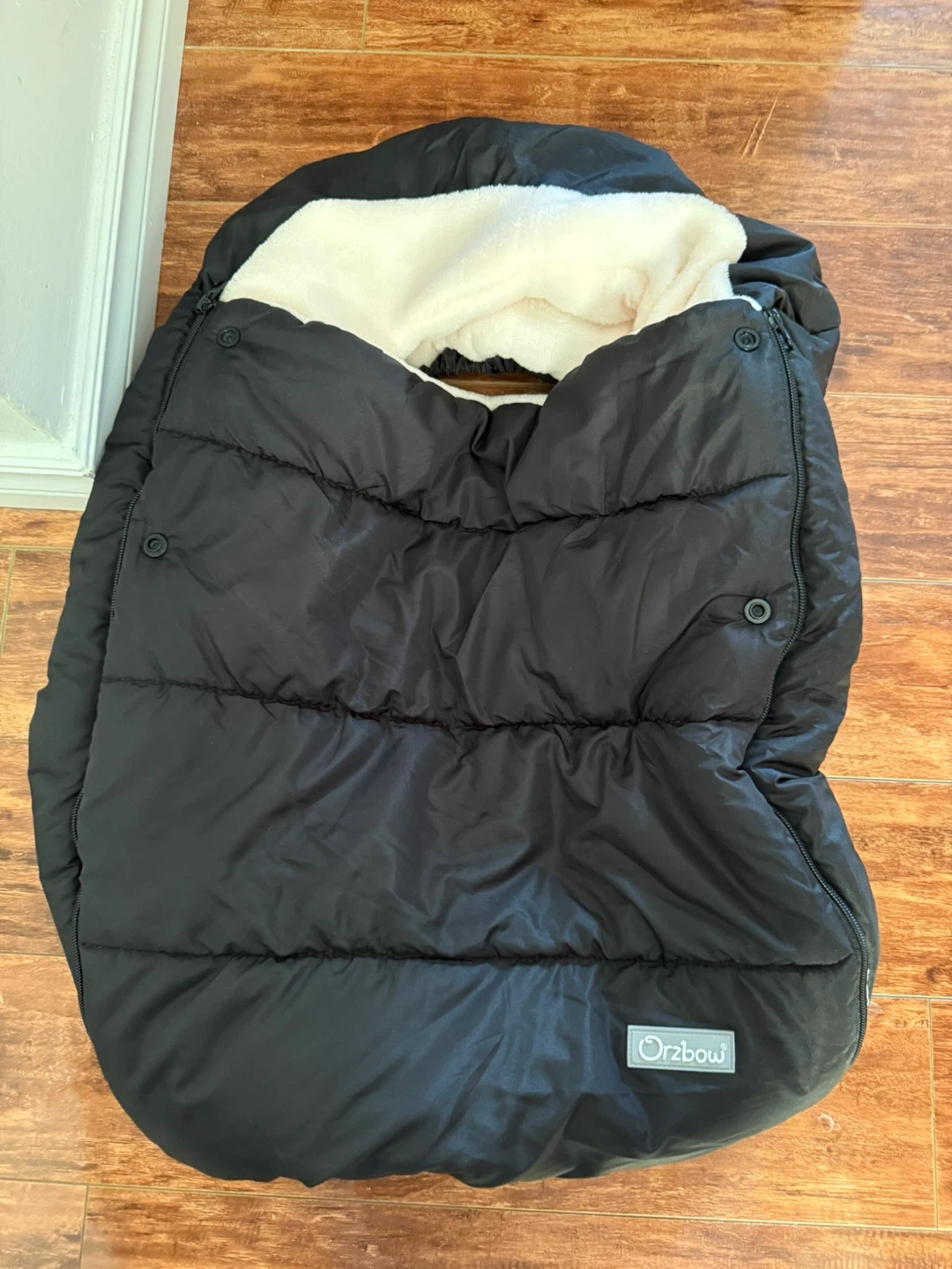 34Keep your little one cozy with this Orzbow stroller footmuff! It's in great condition and perfect for those chilly Canadian days. The soft interior will keep your baby snug and warm during walks. It has a black exterior and a plush, light-coloured interior.