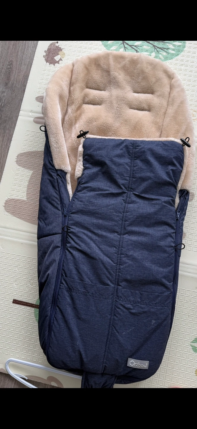 Cozy baby footmuff. Keeps baby warm in cold weather. Suitable for strollers and car seats. Soft, faux fur lining. Durable outer fabric. Zippers for easy access.