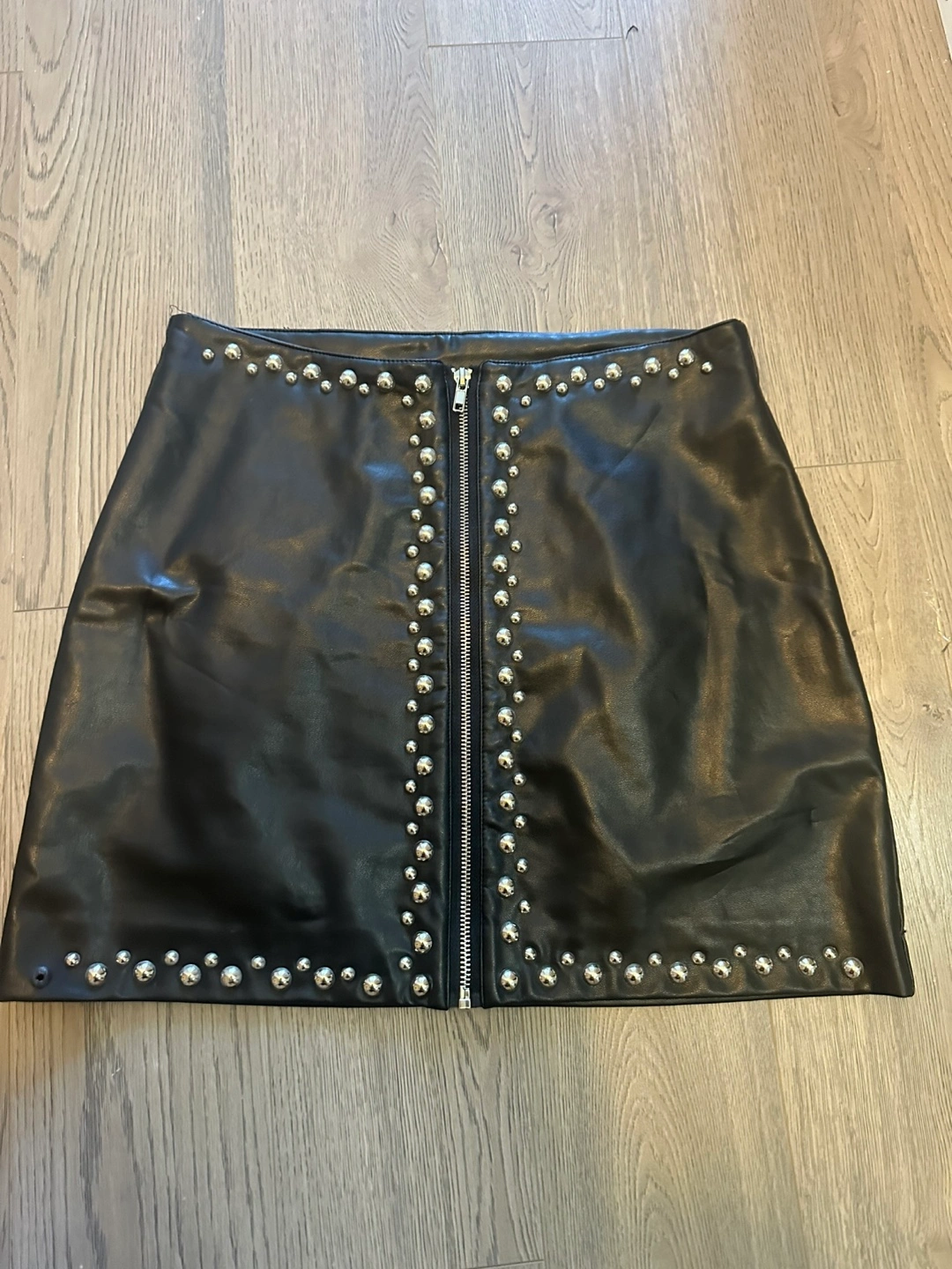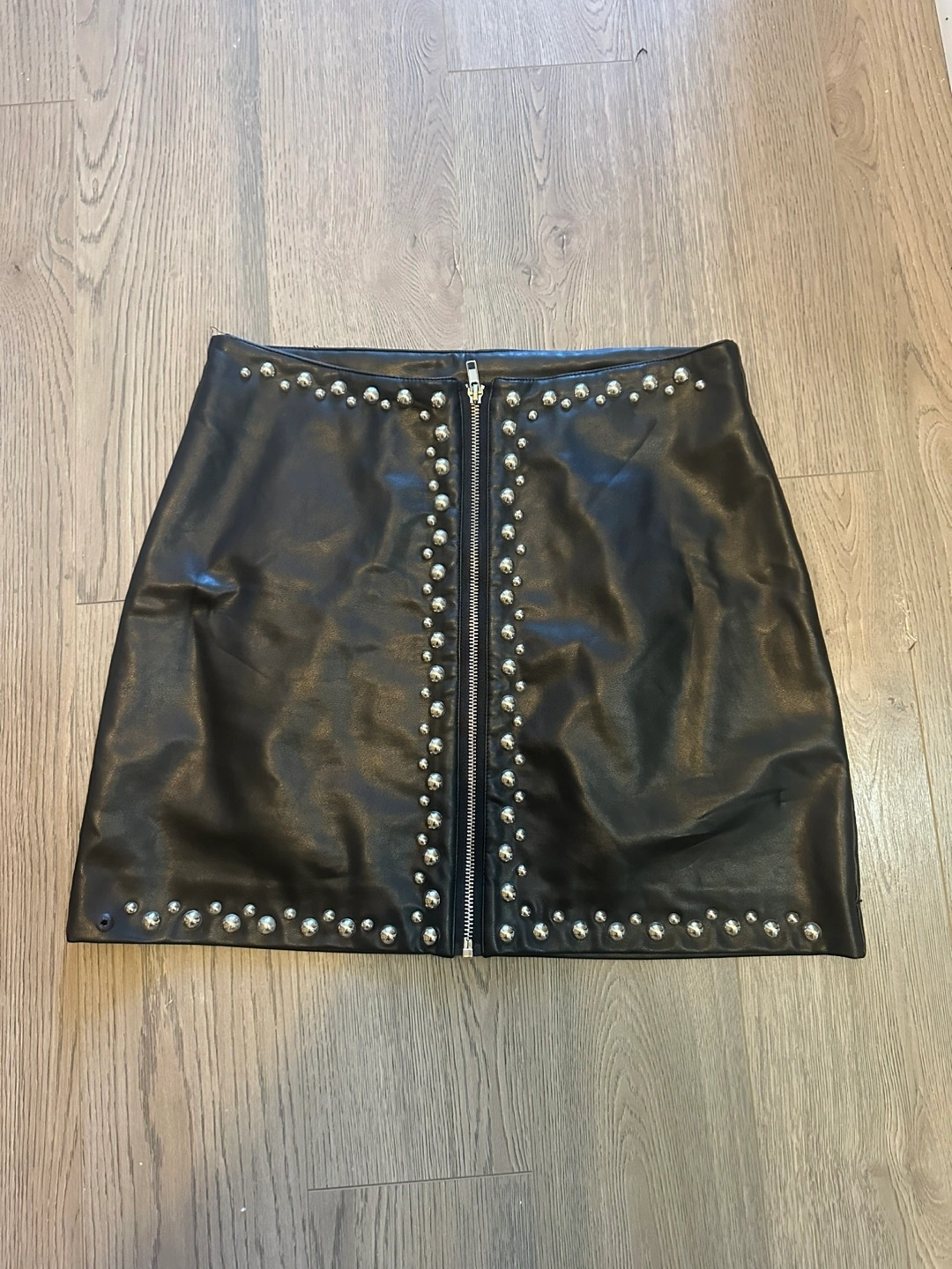 Mini skirt, black faux leather. Silver-toned stud detailing. Front zipper closure. Great for a night out.