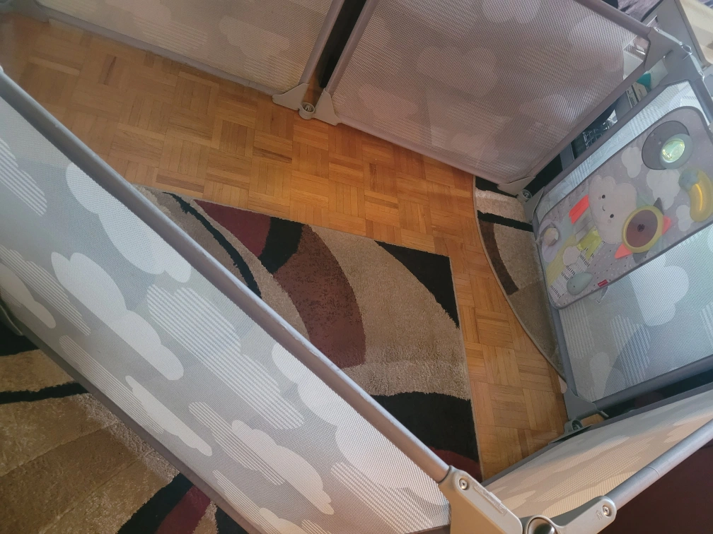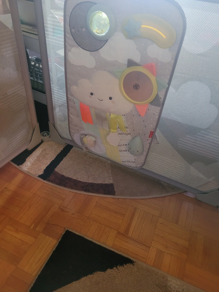 Great Condition, was such a lifesaver when baby started to crawl! The enclosure panels can be formed into multiple configurations, whatever fits your available space, and it is very sturdy. The door panel is super easy to open and close one-handed for adults. Comes with activity board seen in images!