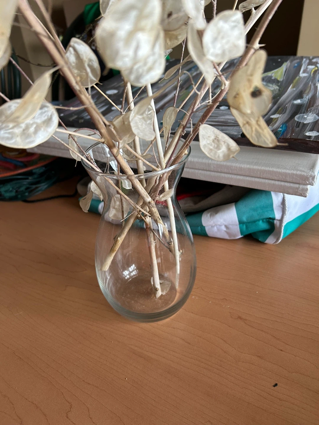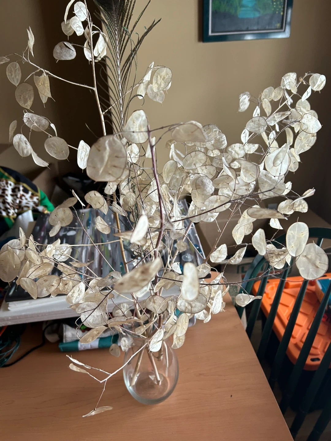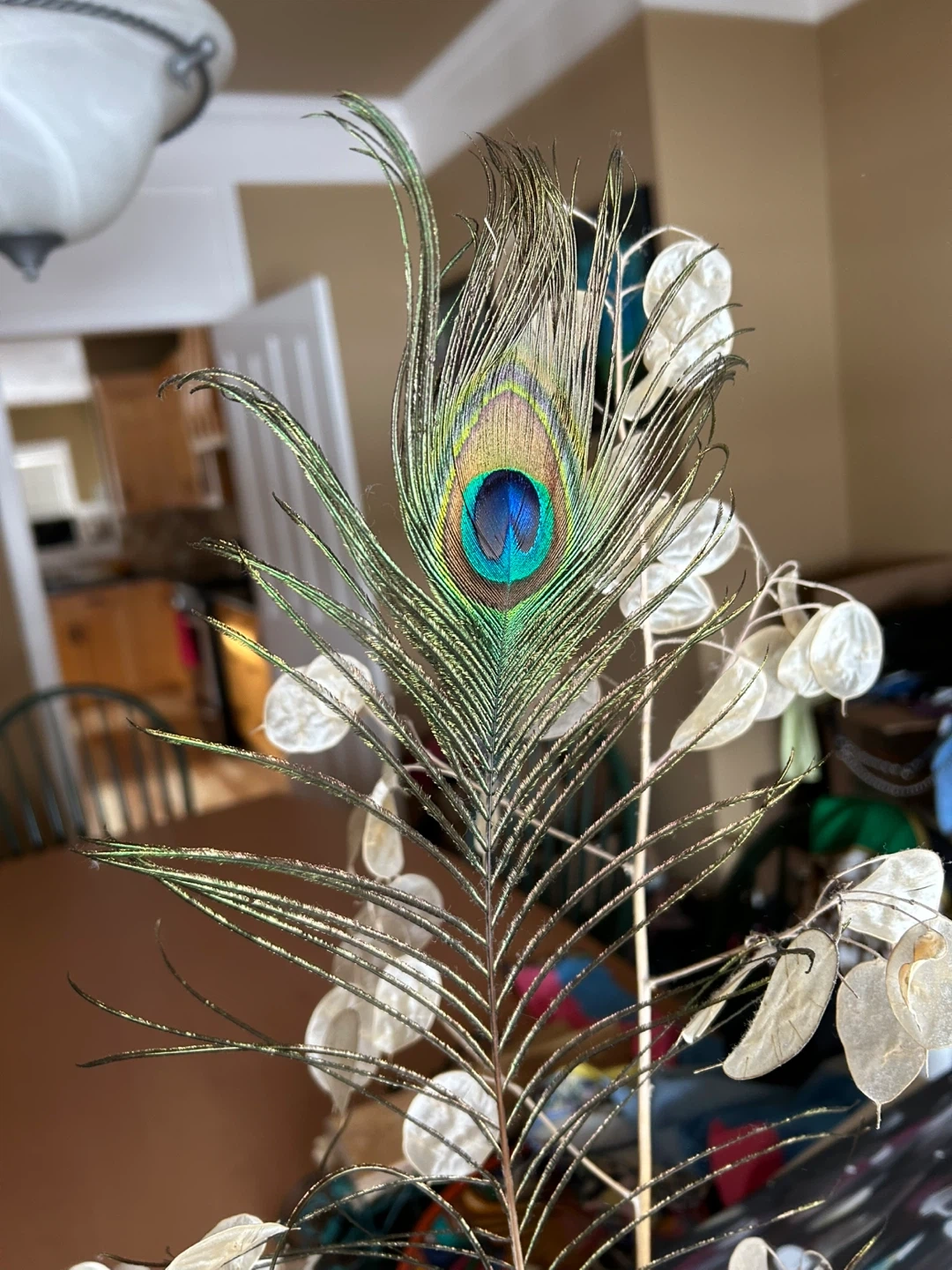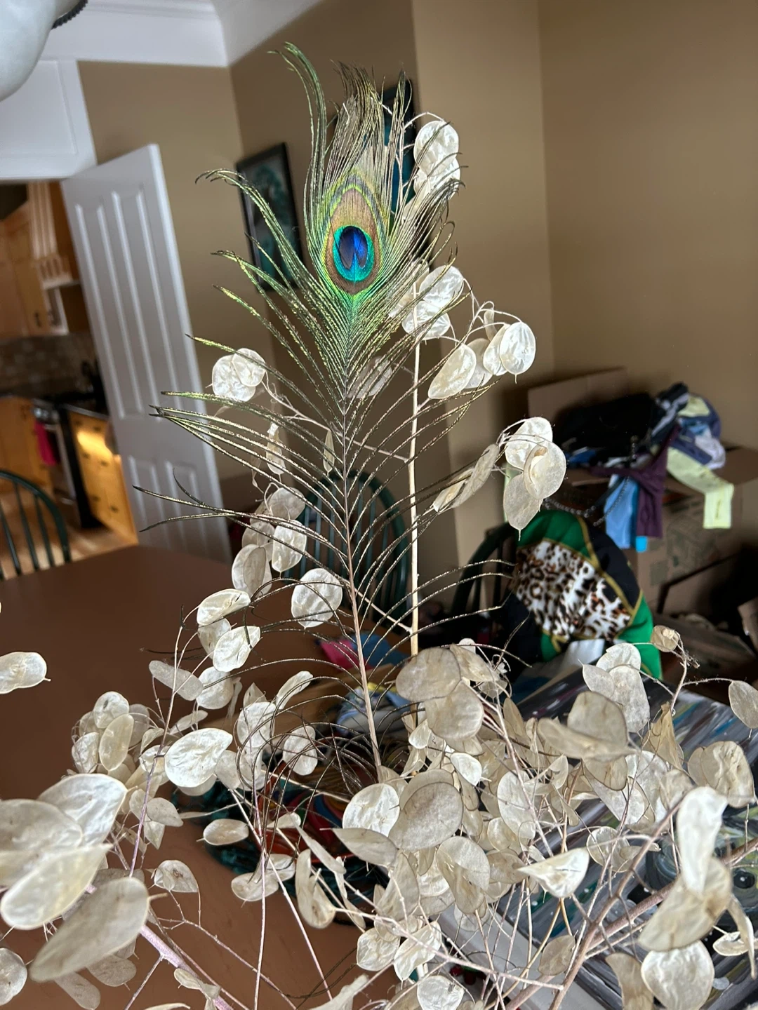 Decorative Dried Lunaria and Peacock Feather Arrangement
