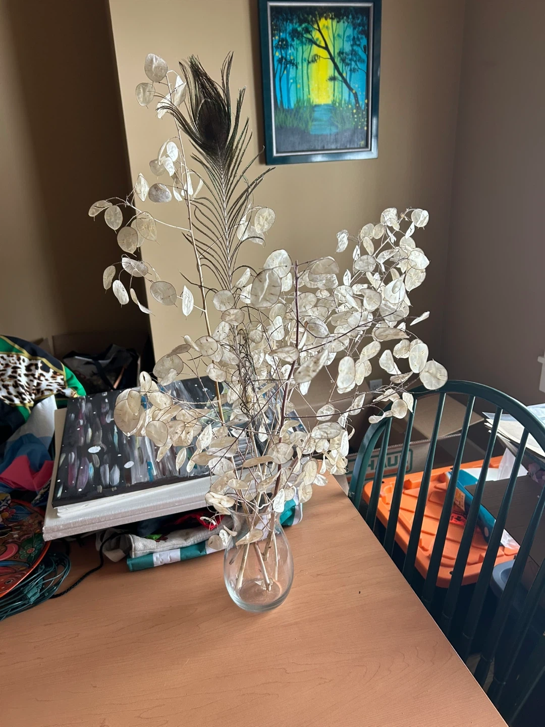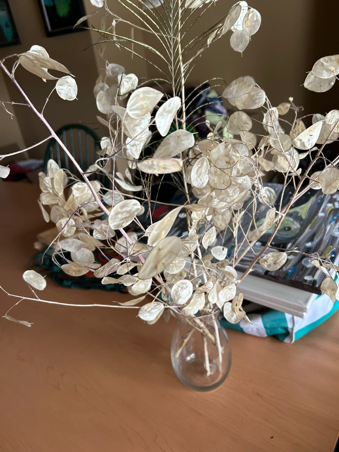 Decorative Dried Lunaria and Peacock Feather Arrangement
