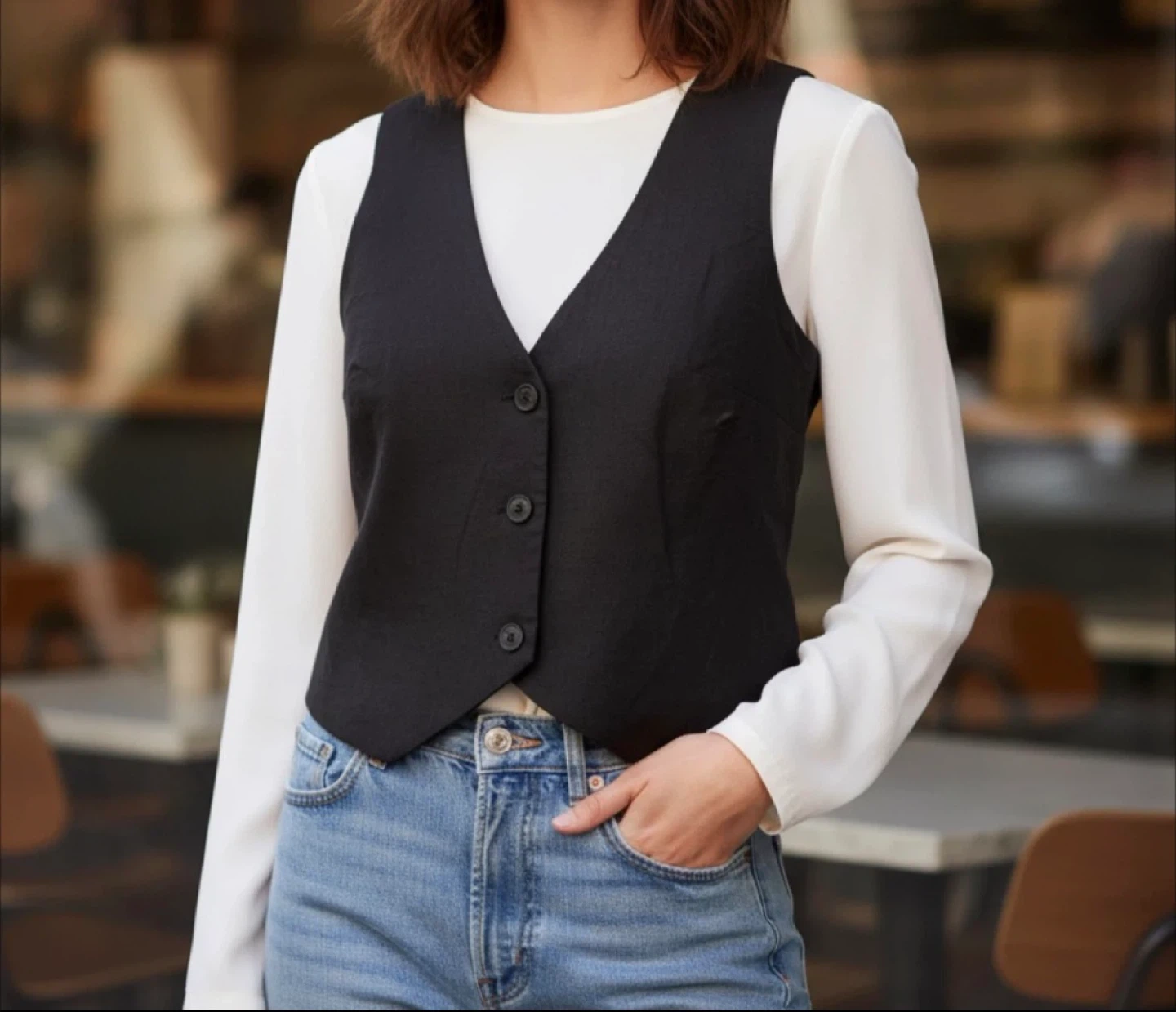 This Dotti black vest features a classic V-neck and button front closure. It's a size 6. Offers a tailored look to any outfit!