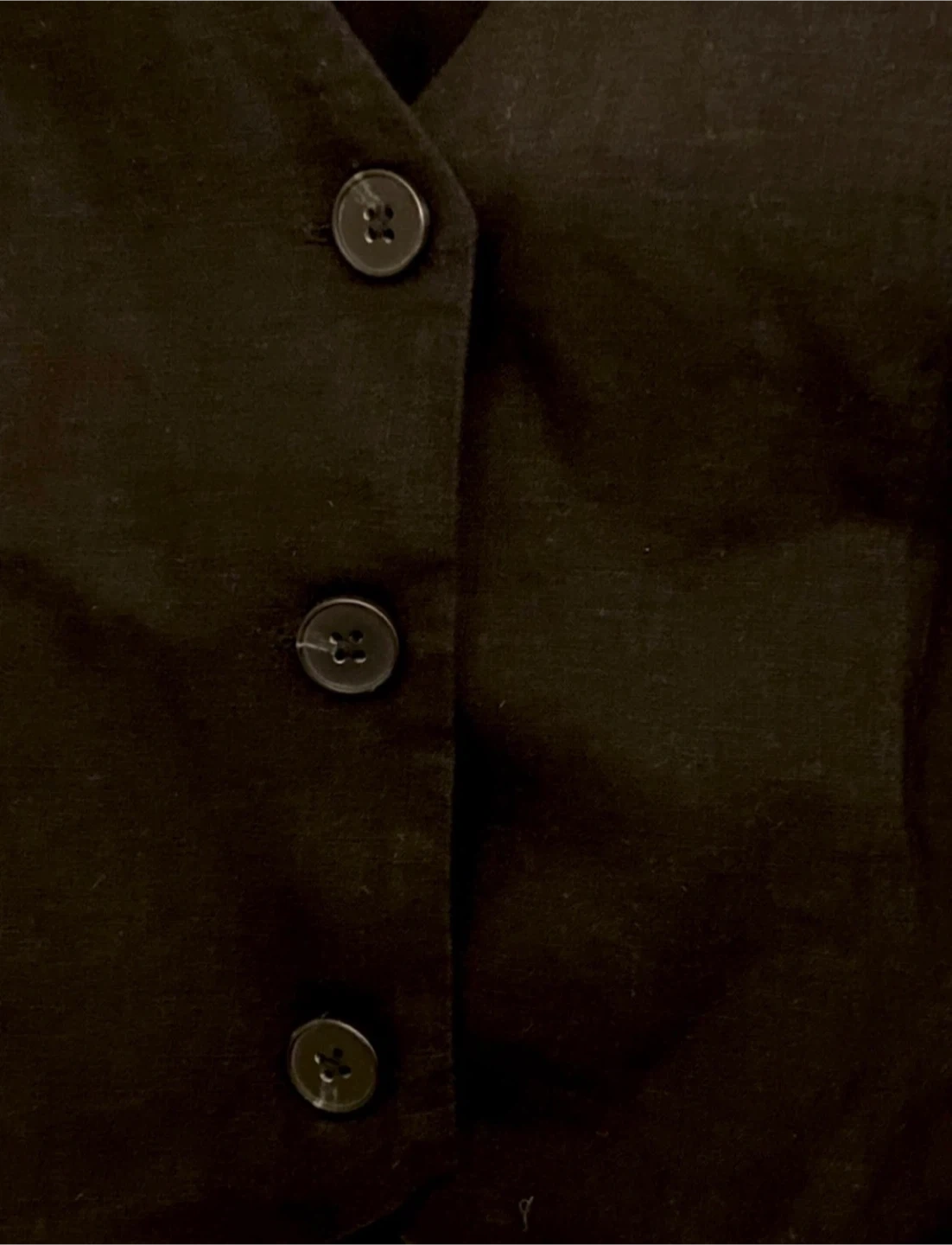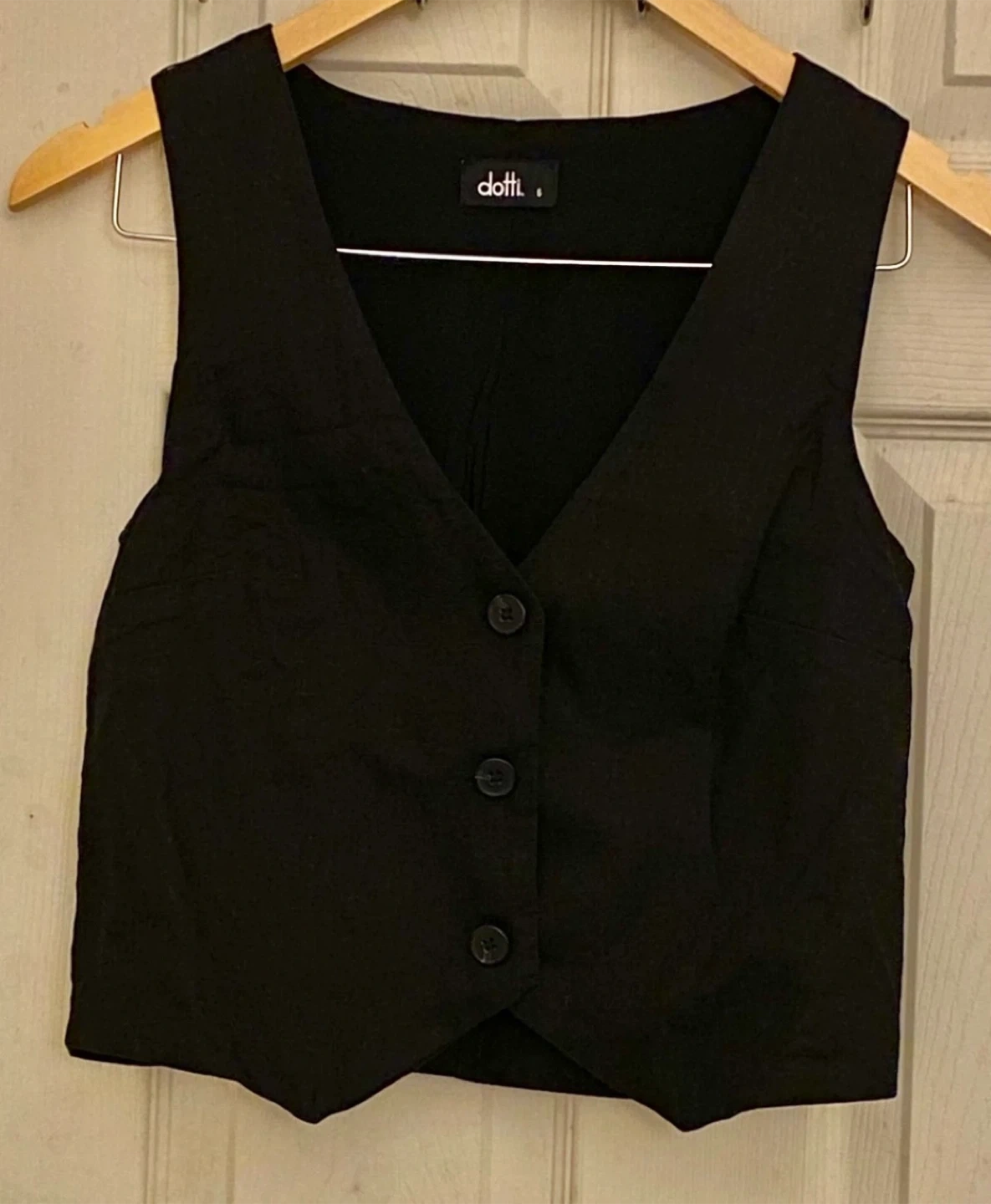 This Dotti black vest features a classic V-neck and button front closure. It's a size 6. Offers a tailored look to any outfit!