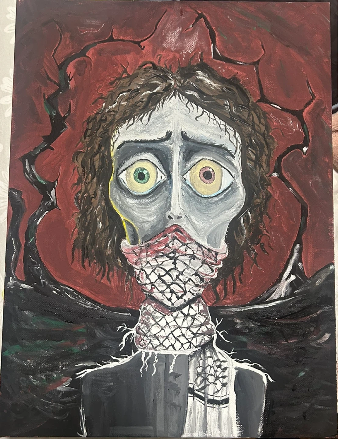 This painting is inspired by the Palestinian experience where voices are often silenced, but the truth remains visible in the eyes.