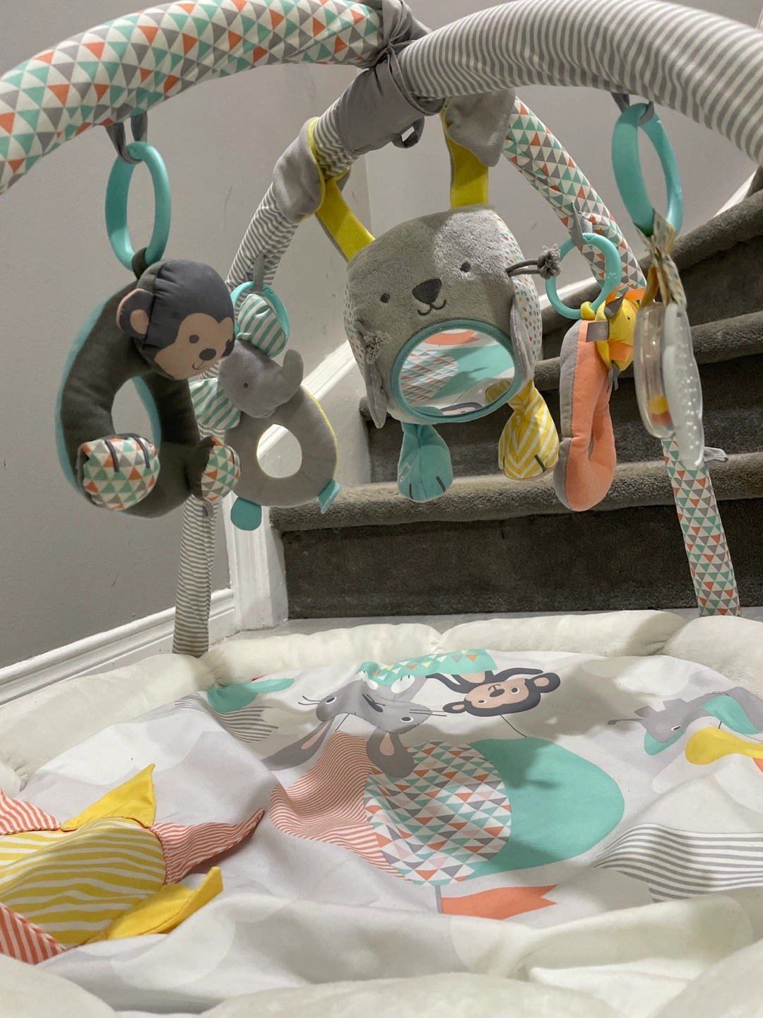 Adorable baby playmat. Soft padded mat. Features hanging toys. Ideal for tummy time. Fun colourful design.