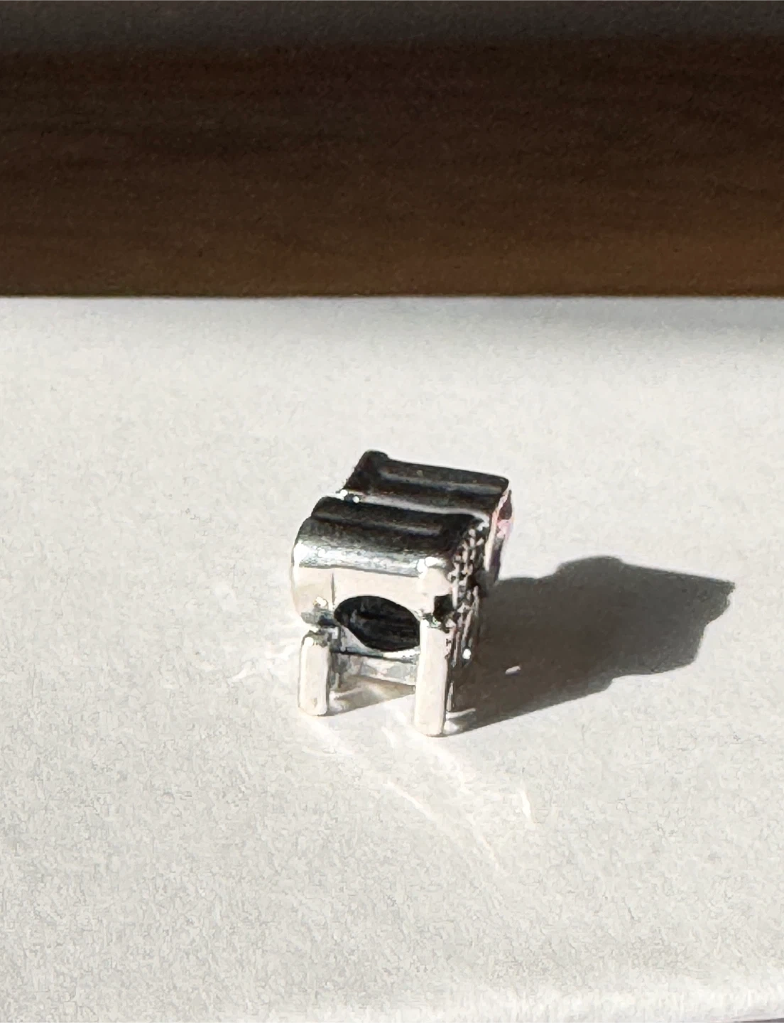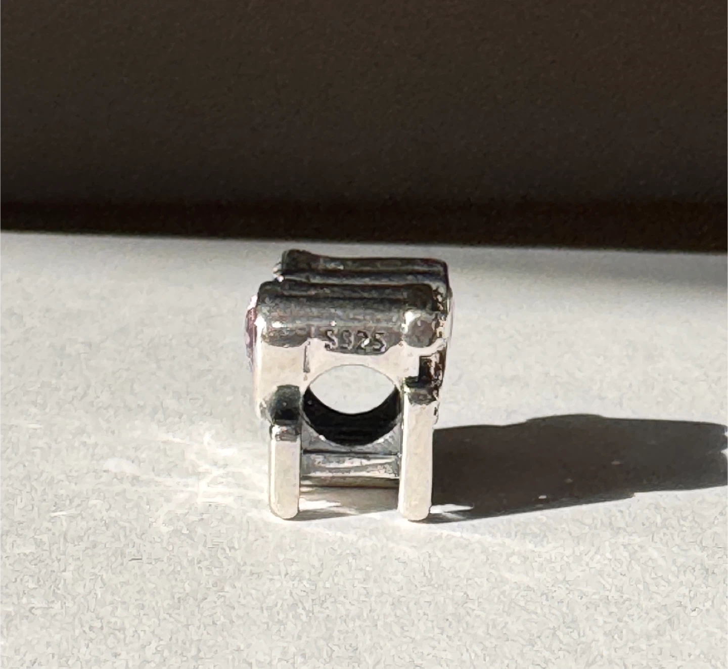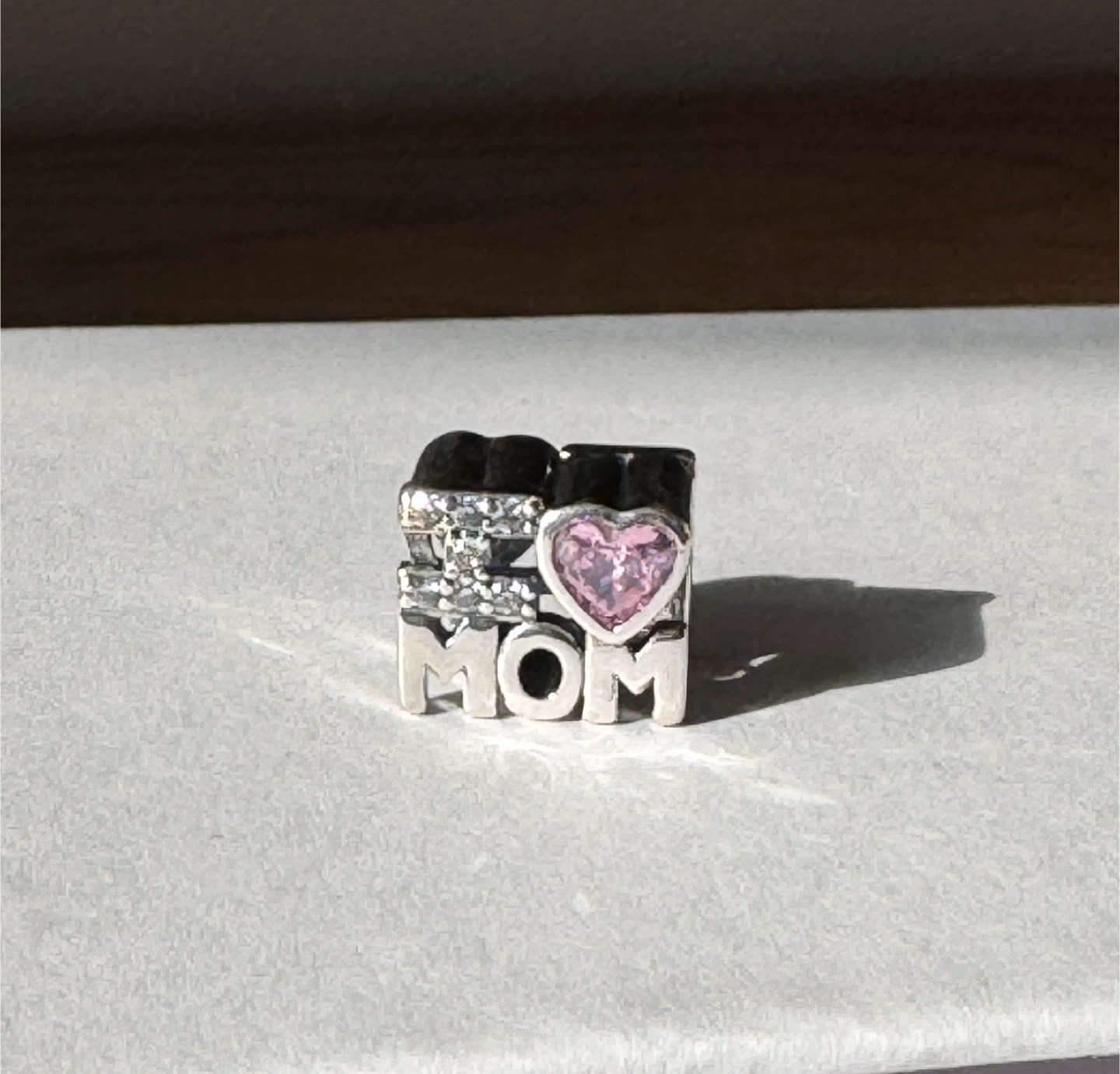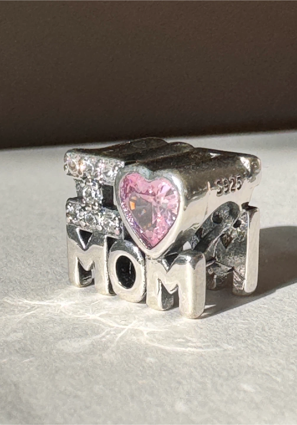 This is a sterling silver charm featuring the words "I Love Mom" with a pink heart. It's stamped with "S925" indicating sterling silver. It's a sweet gift for any mom!