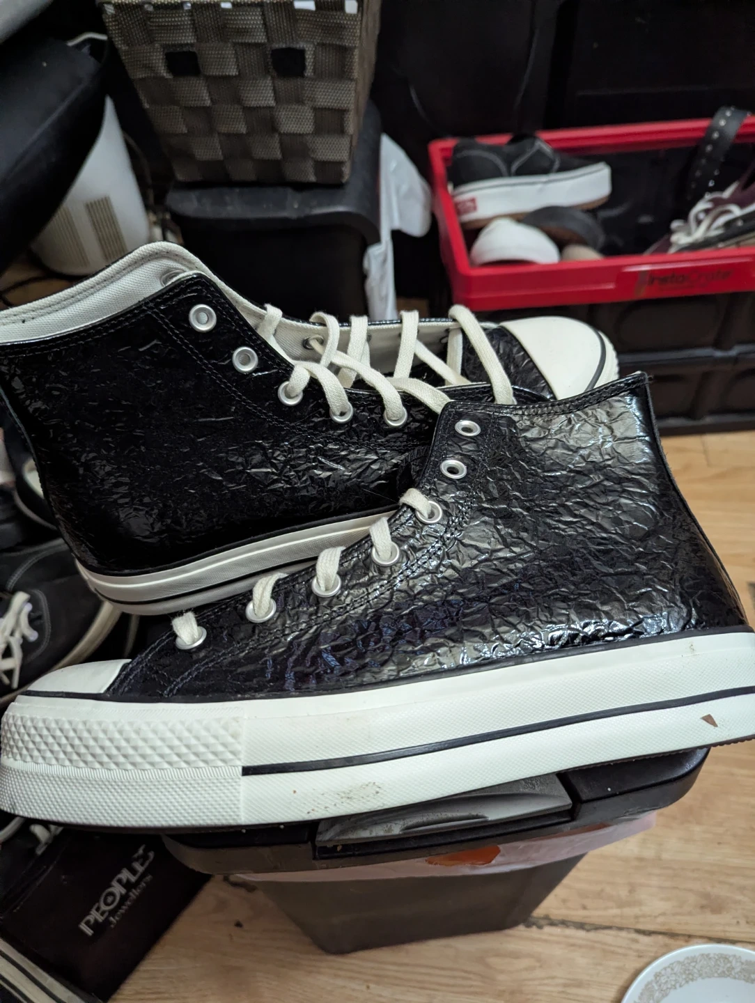 Selling a pair of Converse Chuck Taylor All Star high-tops in women's US size 11. These stylish sneakers feature a leather upper and textile lining. Perfect for adding a cool, edgy touch to any outfit!