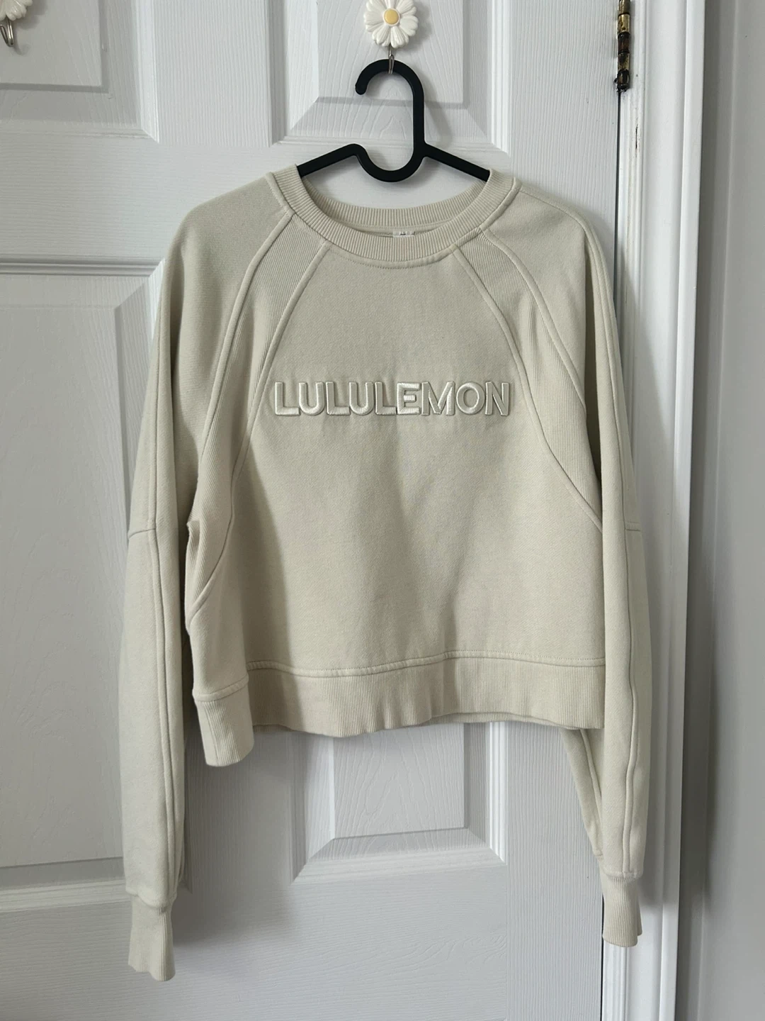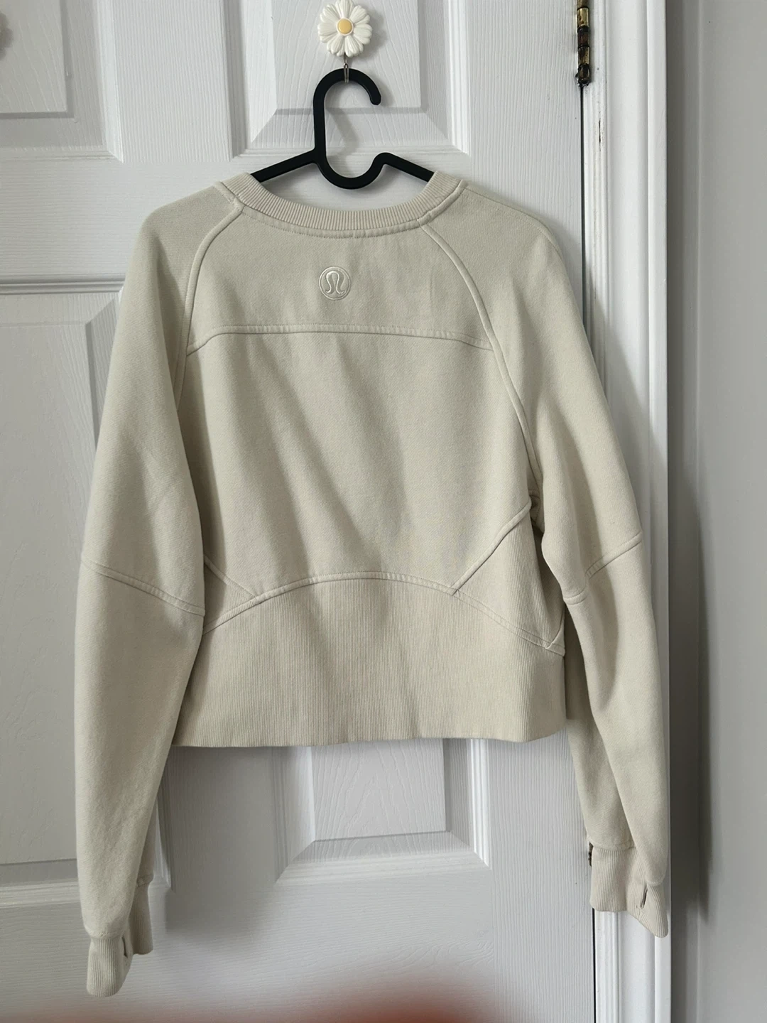 Lightweight Lululemon crewneck sweatshirt in a cream colour. It's a cropped style with raglan sleeves. Made from a soft cotton blend.