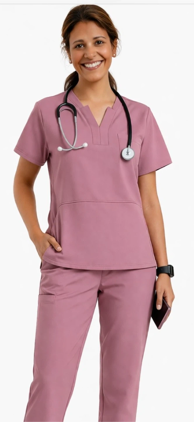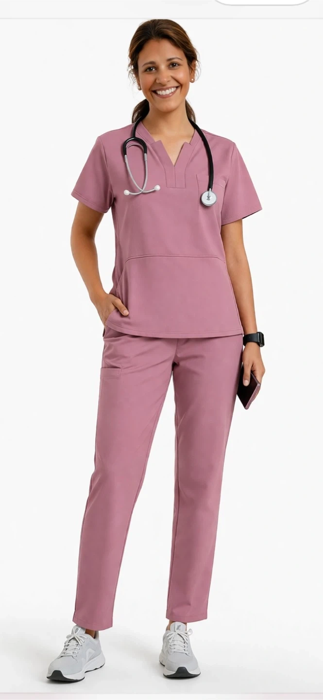This is a women's scrub set in a dusty rose colour. It includes a V-neck top with a chest pocket and drawstring pants with multiple pockets. The fabric is soft and durable for all-day comfort.