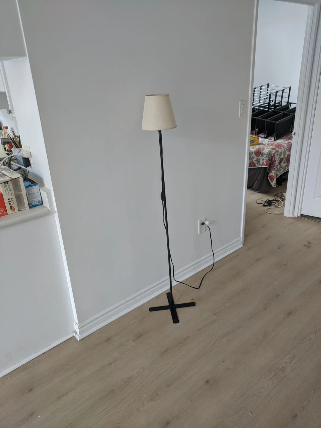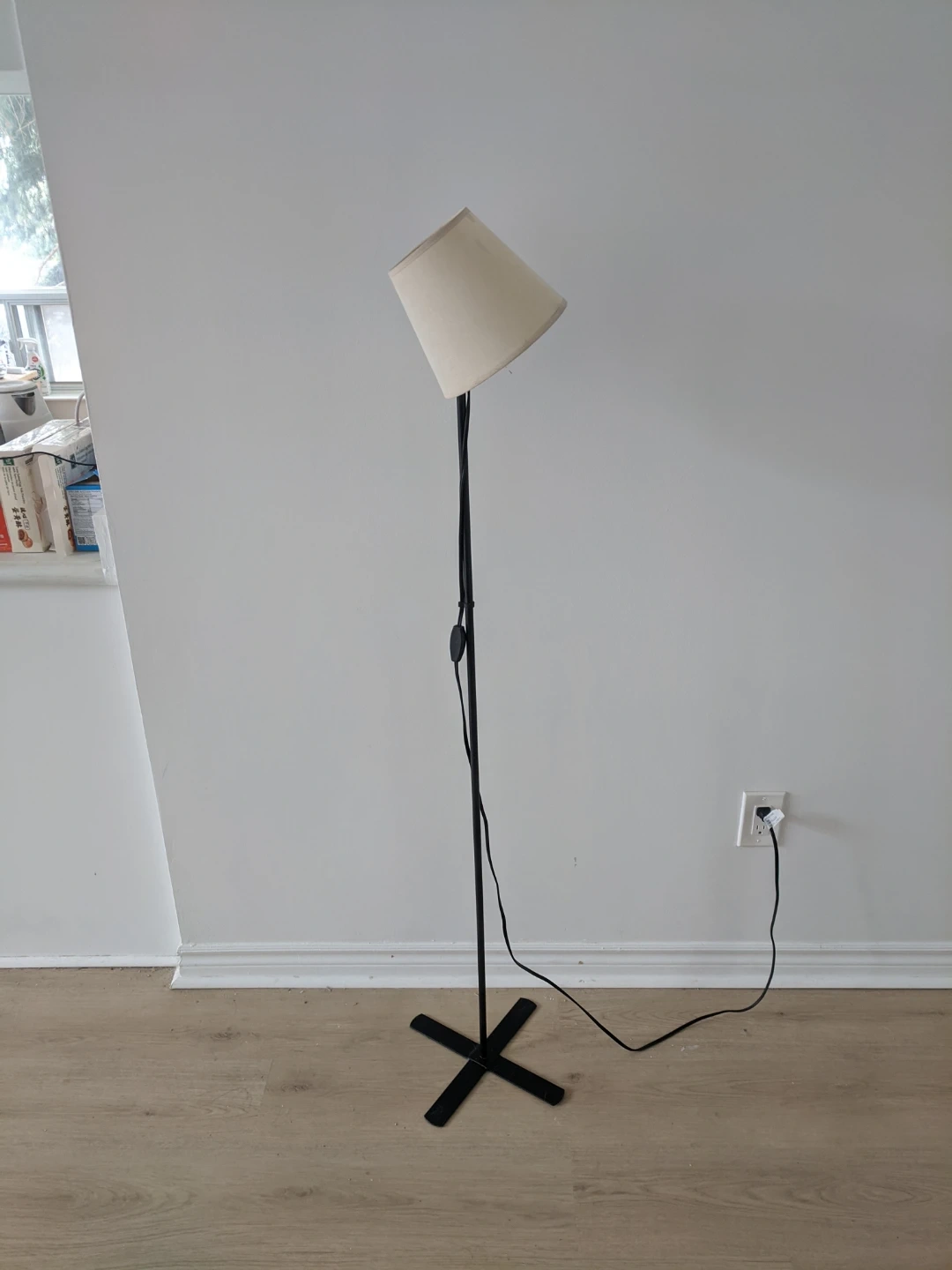 This IKEA BARLAST floor lamp provides convenient lighting. It's made in Romania. The lamp uses a standard bulb and has an inline power switch.